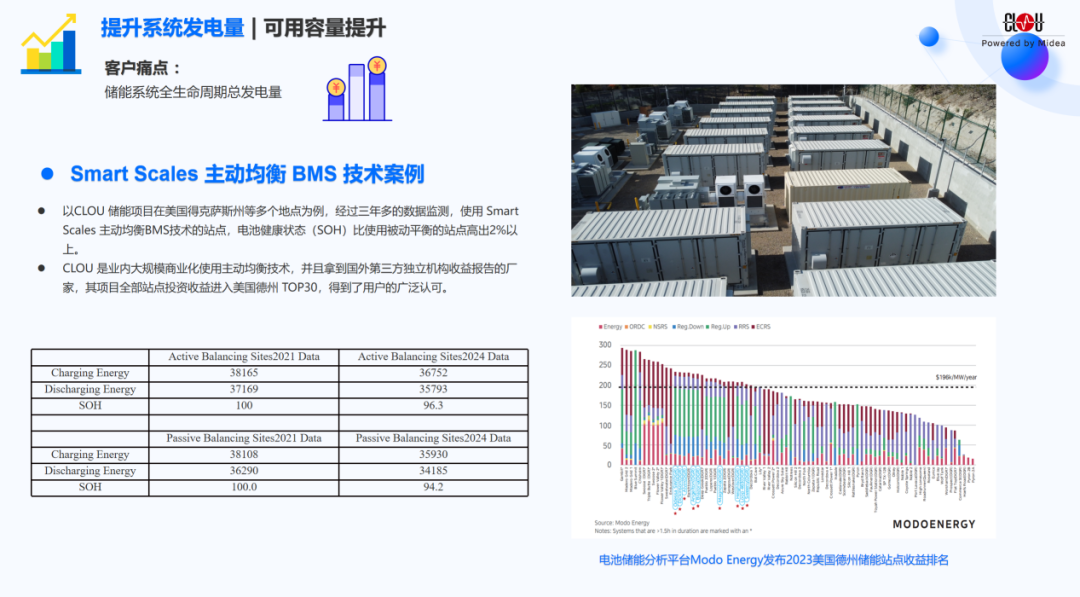 提升总发电量:实现交直流一体 主动均衡,精确控制电芯;采用pack/pcs模块化设计,降低故障损失,提高系统在线率;借助主动均衡技术和先进仿生技术,确保电池一致性良好,提升电池寿命和系统放电量。