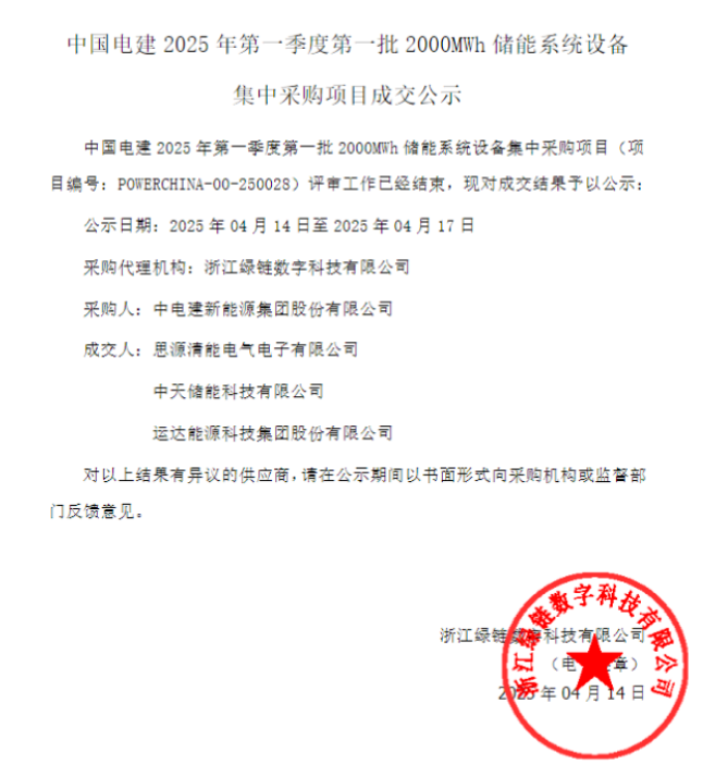 获悉,4月14日,中国电建2025年第一季度第一批2000mwh储能系统设备集中采购项目成交公示。