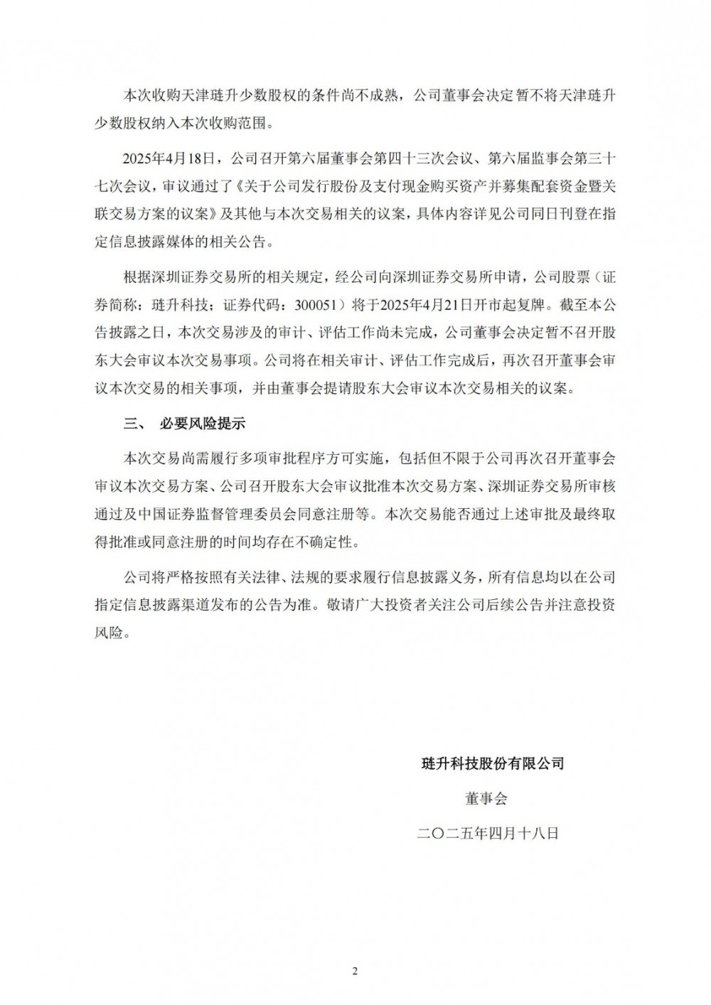 本次收购天津琏升少数股权的条件尚不成熟,公司董事会决定暂不将天津琏升少数股权纳入本次收购范围。