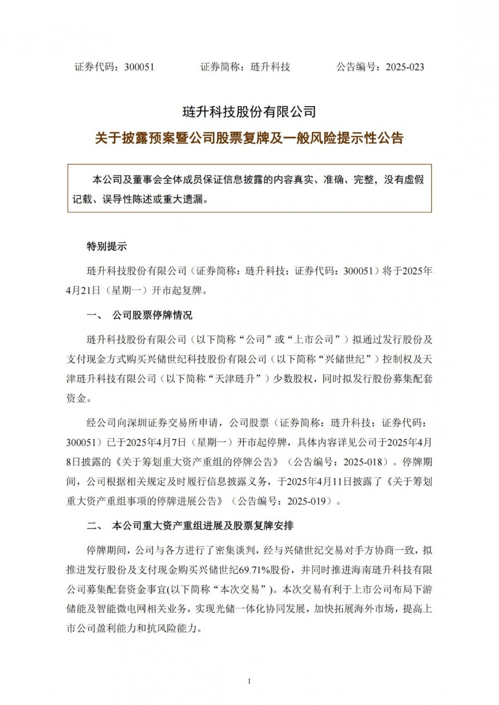 经公司向深圳证券交易所申请,琏升科技股票已于2025年4月7日(星期一)开市起停牌。