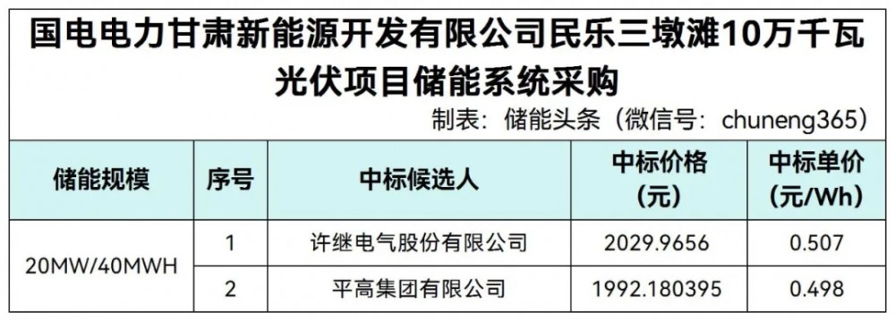 中标候选人第1名为许继电气股份有限公司,投标报价为2029.9656万元,折合单价0.507元/wh;中标候选人第2名为平高集团有限公司,投标报价为1992.180395万元,折合单价0.498元/wh。