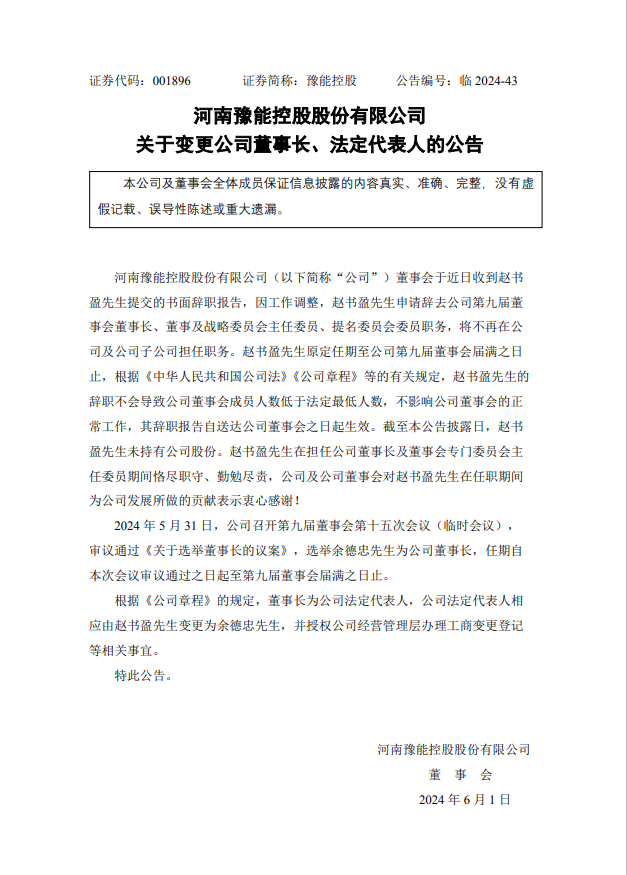 据能源圈了解到,6月1日,豫能控股公告披露,因工作调整,赵书盈先生申请辞去公司第九届董事会董事长、董事及战略委员会主任委员、提名委员会委员职务,不再在公司及公司子公司担任职务。