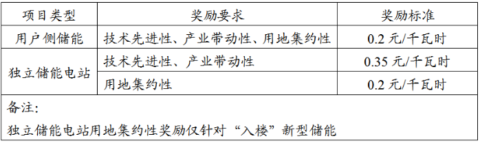 文件提出,对纳入新型储能示范项目目录(要求见附件)管理的新型储能,根据实际放电量给予奖励,每千瓦时储能容量的年电量奖励上限600千瓦时,奖励期3年。奖励要求及标准见下表。奖励电量的起始时间以电网企业电量计量装置安装时间(从0开始计量)为准。