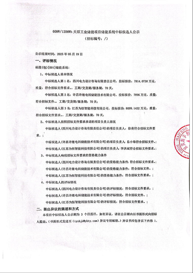 5月16日,宜宾海丰和锐有限公司60mw/120mwh天原工业储能项目储能系统中标侯选人公示。