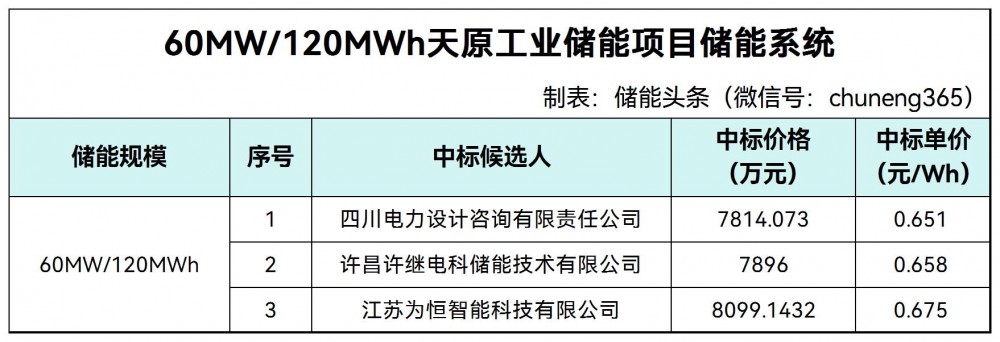 第一中标候选人为四川电力设计咨询有限责任公司,投标报价7814.073万元,折合单价0.651元/wh;第二中标候选人为许昌许继电科储能技术有限公司,投标报价7896万元,折合单价0.658元/wh;第三中标候选人为江苏为恒智能科技有限公司,投标报价8099.1432万元,折合单价0.675元/wh。
