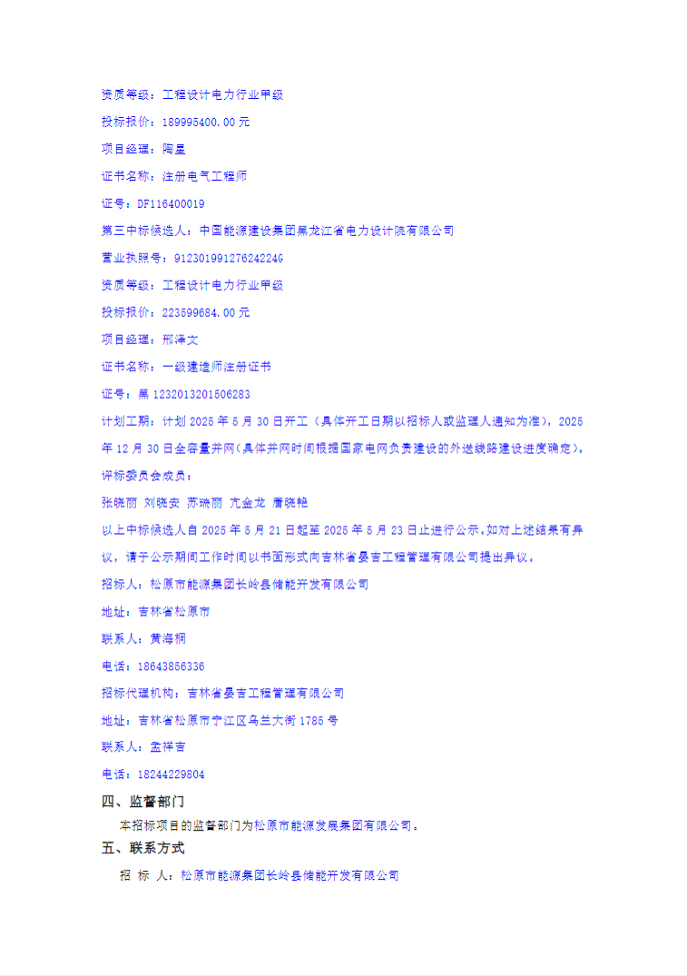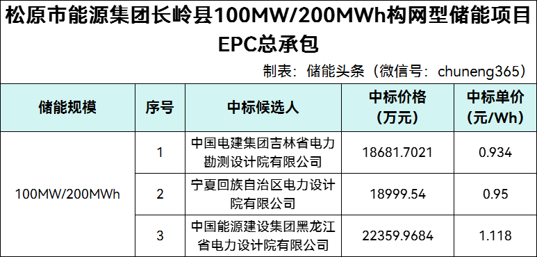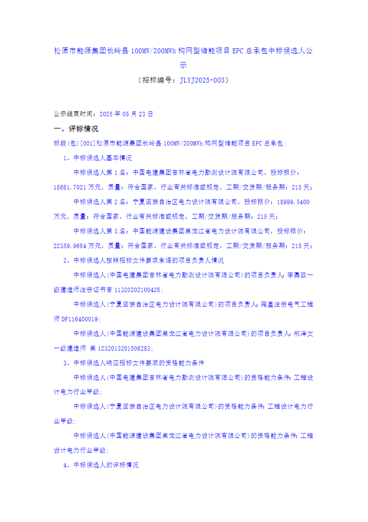 第一中标候选人为中国电建集团吉林省电力勘测设计院有限公司,投标报价18681.7021万元,折合单价0.934元/wh;第二中标候选人为宁夏回族自治区电力设计院有限公司,投标报价18999.54万元,折合单价0.95元/wh;第三中标候选人为中国能源建设集团黑龙江省电力设计院有限公司,投标报价22359.9684万元,折合单价1.118元/wh。