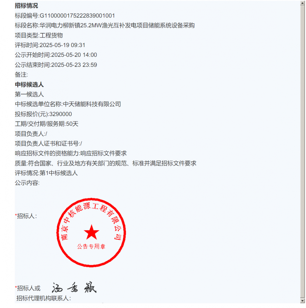 5月20日,华润电力柳新镇25.2mw渔光互补发电项目储能系统设备采购评标结果公示发布。