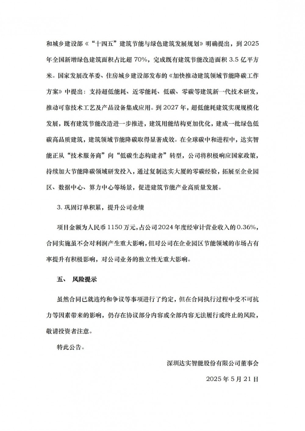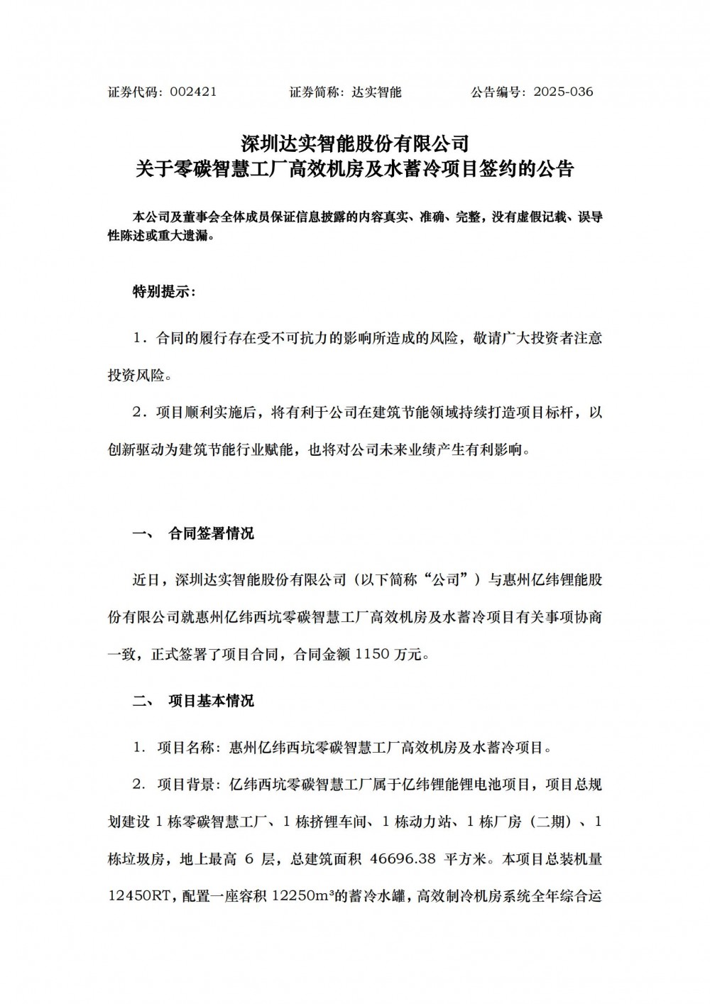 5月21日,达实智能发布公告称,公司与惠州亿纬锂能股份有限公司就惠州亿纬西坑零碳智慧工厂高效机房及水蓄冷项目有关事项协商一致,正式签署了项目合同,合同金额1150万元。