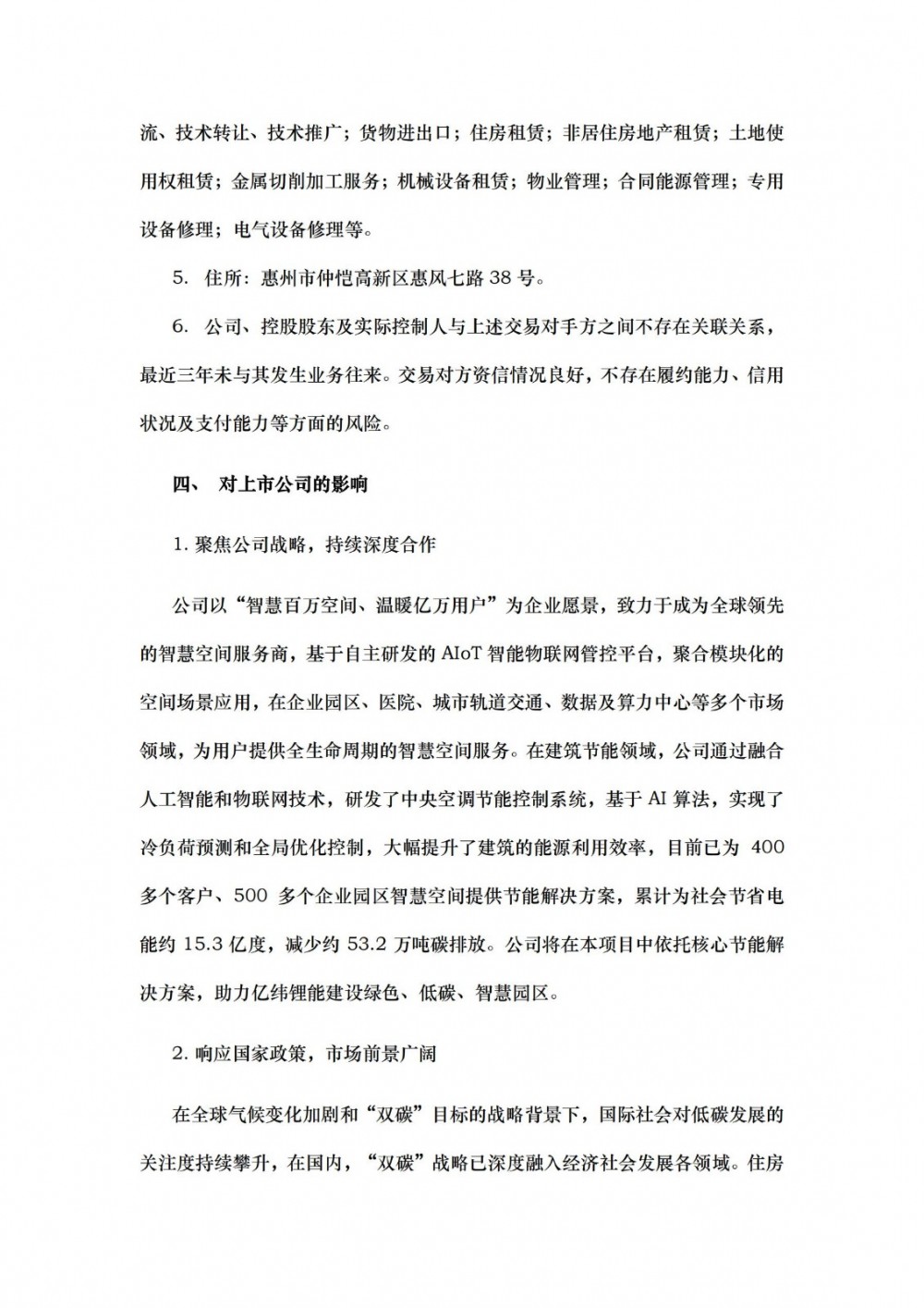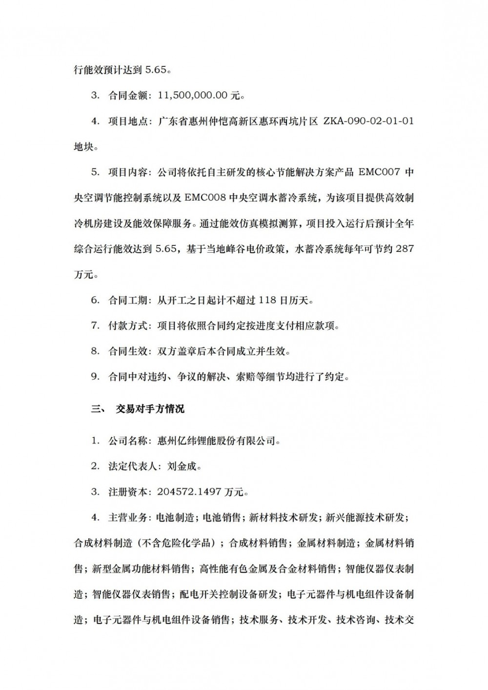 达实智能表示,公司以“智慧百万空间、温暖亿万用户”为企业愿景,致力于成为全球领先的智慧空间服务商,基于自主研发的aiot智能物联网管控平台,聚合模块化的空间场景应用,在企业园区、医院、城市轨道交通、数据及算力中心等多个市场领域,为用户提供全生命周期的智慧空间服务。在建筑节能领域,公司通过融合人工智能和物联网技术,研发了中央空调节能控制系统,基于ai算法,实现了冷负荷预测和全局优化控制,大幅提升了建筑的能源利用效率,目前已为400多个客户、500多个企业园区智慧空间提供节能k8凯发的解决方案,累计为社会节省电能约15.3亿度,减少约53.2万吨碳排放。公司将在本项目中依托核心节能k8凯发的解决方案,助力亿纬锂能建设绿色、低碳、智慧园区。
