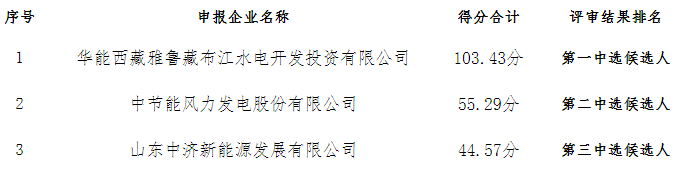公示显示,华能西藏雅鲁藏布江水电开发投资有限公司以得分103.43分为第一中选候选人;中节能风力发电股份有限公司以得分55.29分为第二中选候选人;山东中济新能源发展有限公司以得分44.57分为第三中选候选人。