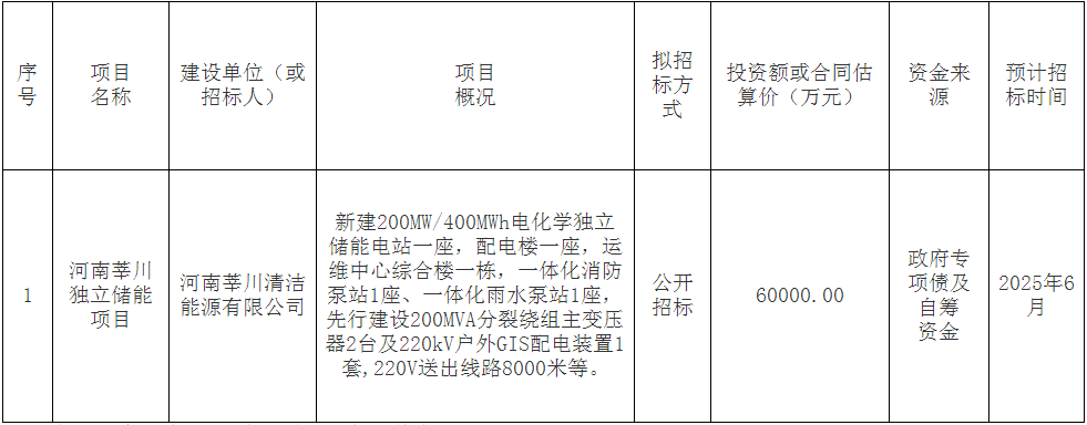 5月22日,三门峡市公共资源交易中心发布河南莘川独立储能项目—招标计划。