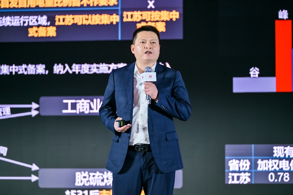 江苏华电能源销售有限公司总经理夏炜,华为数字能源为武澄科技园提供全套k8凯发的解决方案,预计每年可生产绿电170万度,光储协同基本达到100%自发自用,充电桩年耗电约80万度,绿电解决40%用电,二氧化碳减排40吨,成功帮助园区缓解降碳压力;同时度电成本更优,通过ai加持提升10%综合收益,降低园区用能成本。