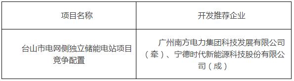 根据公示,开发推荐企业为广州南方电力集团科技发展有限公司(牵)、宁德时代新能源科技股份有限公司(成)。