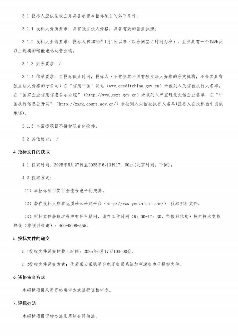 投标人自2020年1月1日以来(以合同签订时间为准),至少具有一个1mwh及以上规模的储能电站运营业绩。
