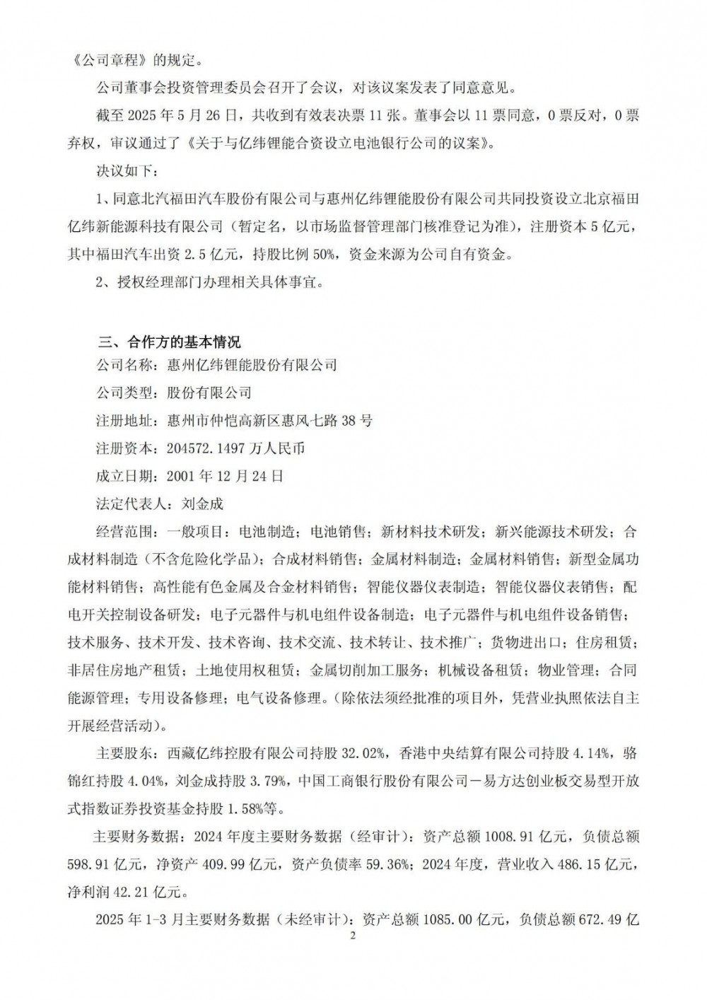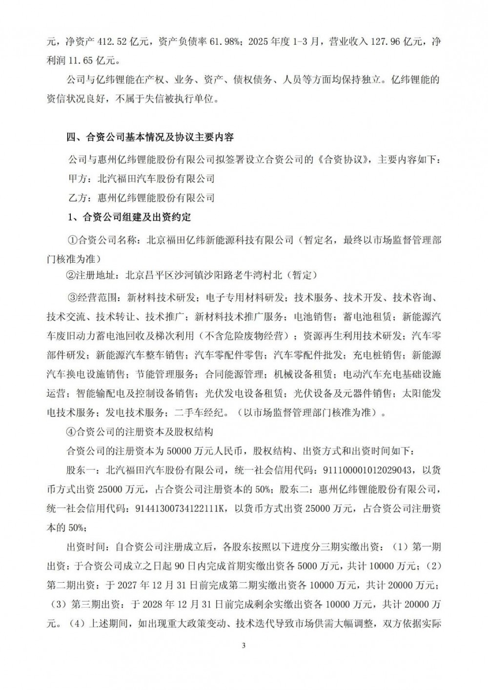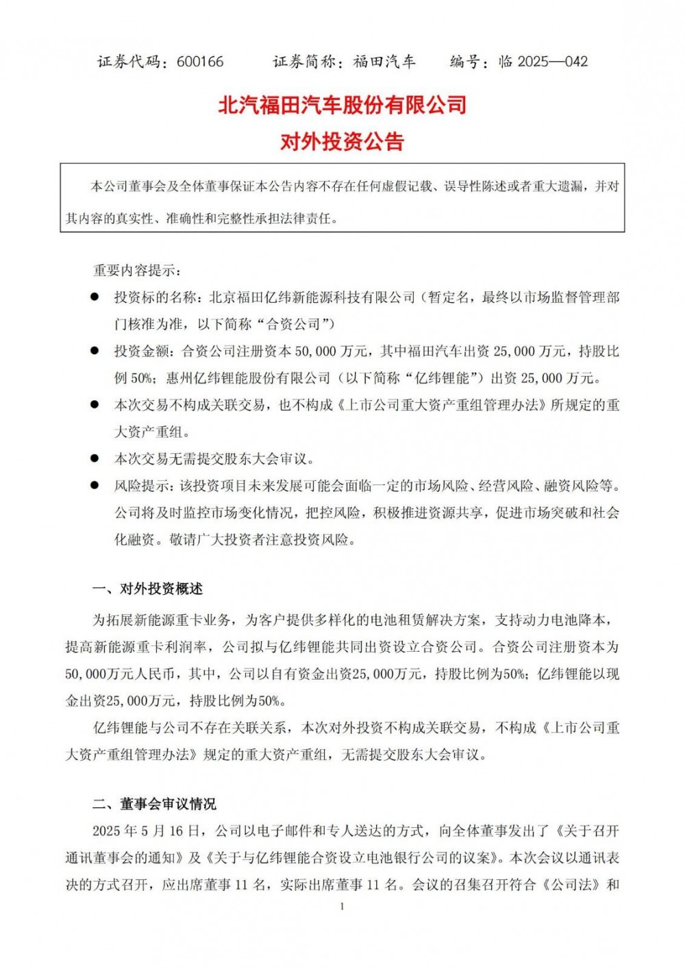 5月26日,福田汽车发布公告称,为拓展新能源重卡业务,为客户提供多样化的电池租赁k8凯发的解决方案,支持动力电池降本,提高新能源重卡利润率,公司拟与亿纬锂能共同出资设立合资公司。合资公司注册资本为50,000万元人民币,其中,公司以自有资金出资25,000万元,持股比例为50%;亿纬锂能以现金出资25,000万元,持股比例为50%。