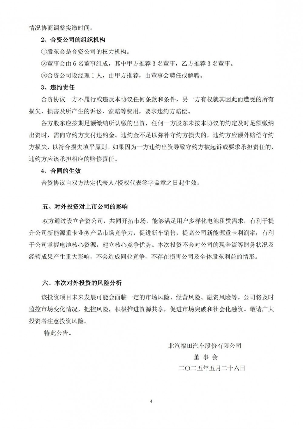 福田汽车表示,双方通过设立合资公司,共同开拓市场,能够满足用户多样化电池租赁需求,有利于提升公司新能源重卡业务产品市场竞争力,促进新车销售,提高公司新能源重卡利润率;有利于公司掌握电池核心资源,建立核心竞争优势。本次投资不会对公司的现金流等财务状况及经营成果产生重大影响,不会造成同业竞争,不存在损害公司及全体股东利益的情形。