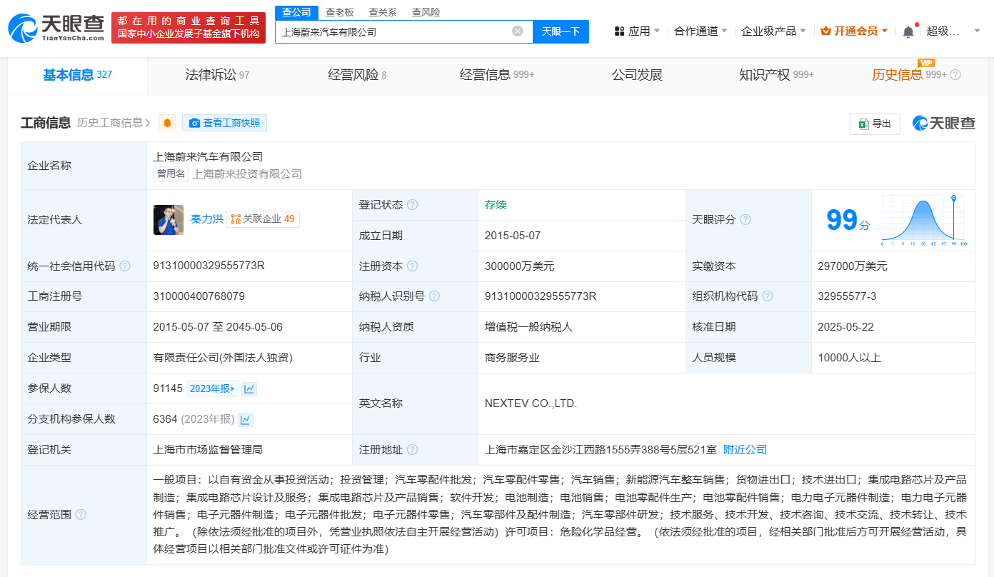蔚来上海公司新增电池制造业务