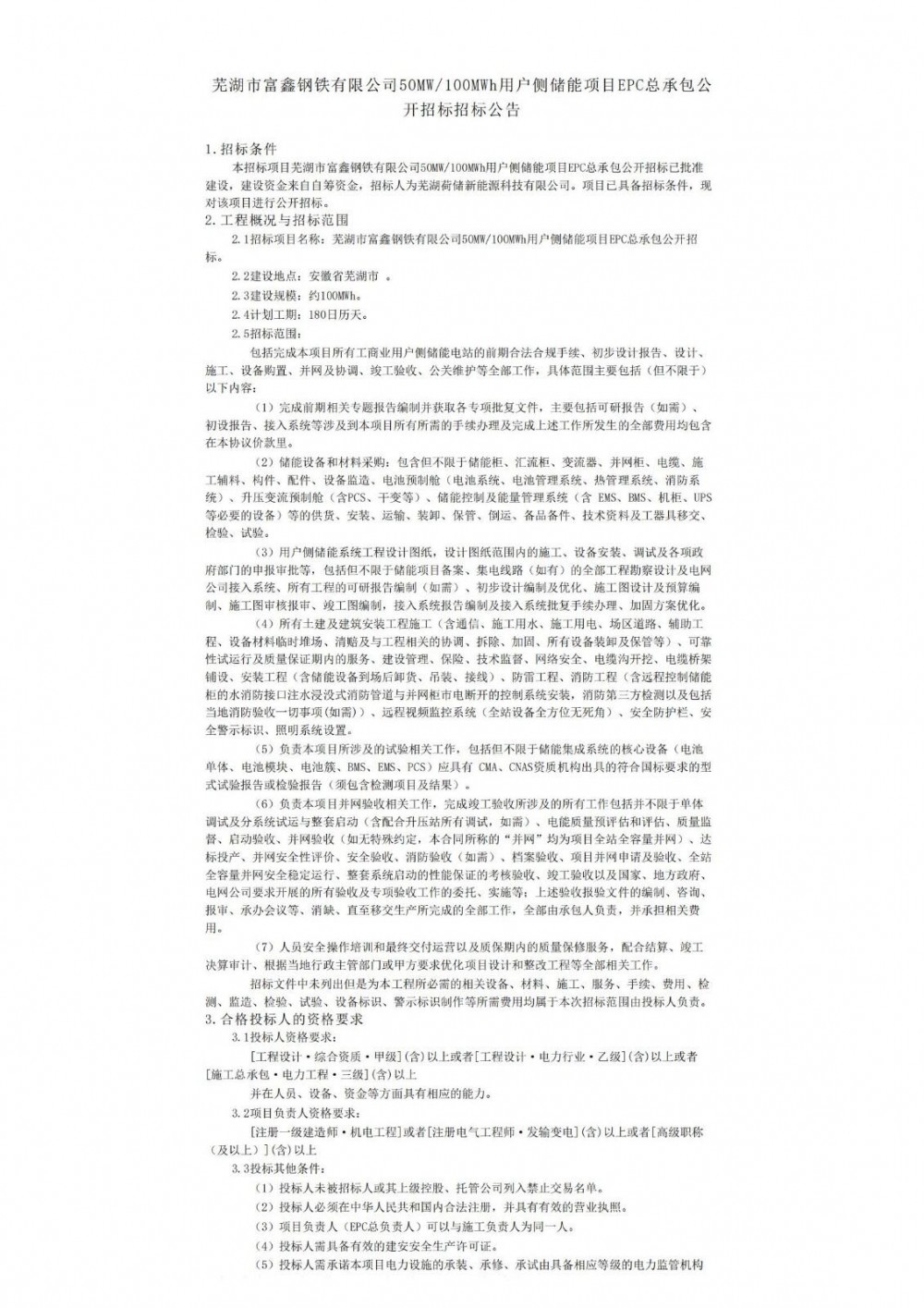 5月27日,芜湖市富鑫钢铁有限公司50mw/100mwh用户侧储能项目epc总承包公开招标招标公告发布。
