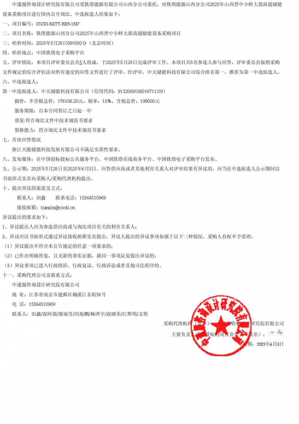 5月28日,铁塔能源山西分公司2025年山西晋中小鲜大郭商超储能设备采购项目中选候选人结果公示。