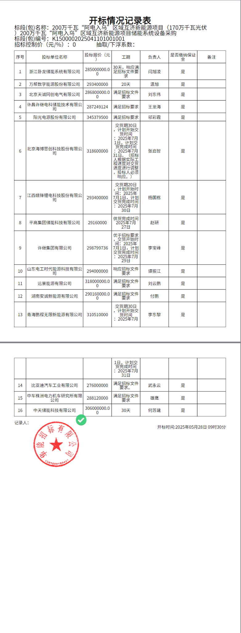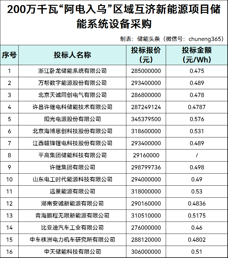 16家企业参与,有效报价15家,报价范围0.46-0.576元/wh,平均报价0.499元/wh。最低报价来自比亚迪汽车工业有限公司,最高报价来自阳光电源股份有限公司。