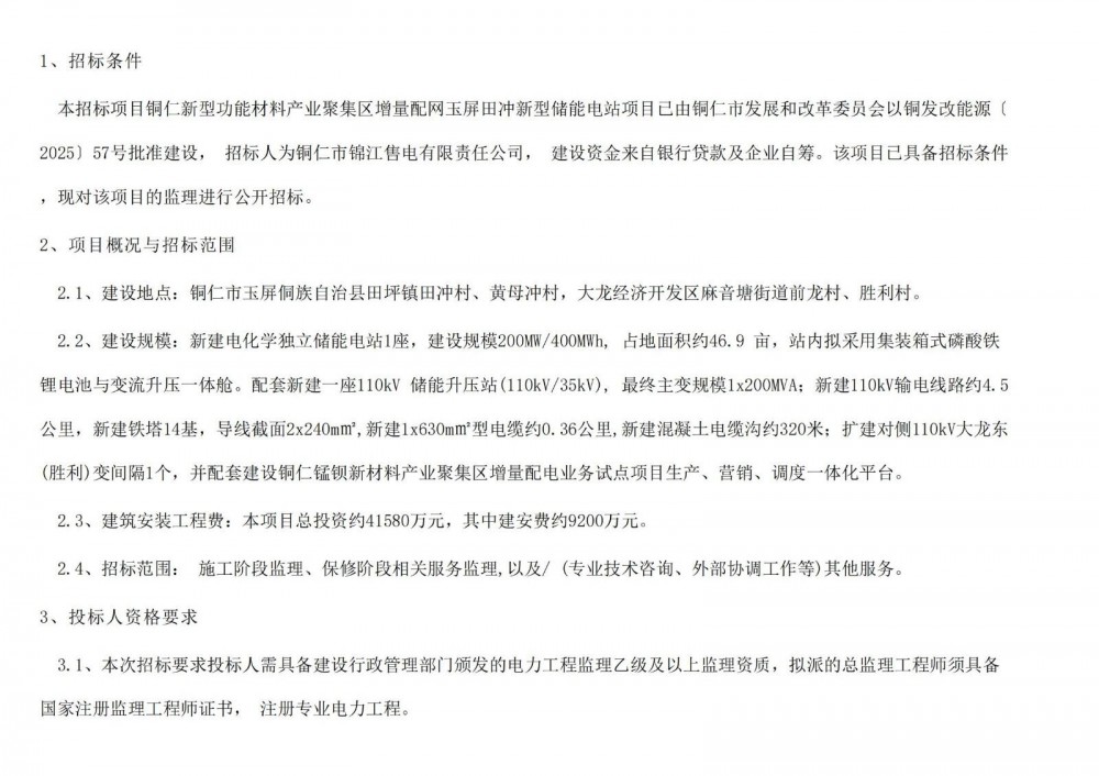 5月28日,铜仁新型功能材料产业聚集区增量配网玉屏田冲新型储能电站项目监理公告发布。