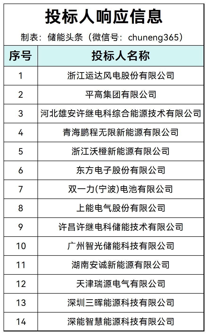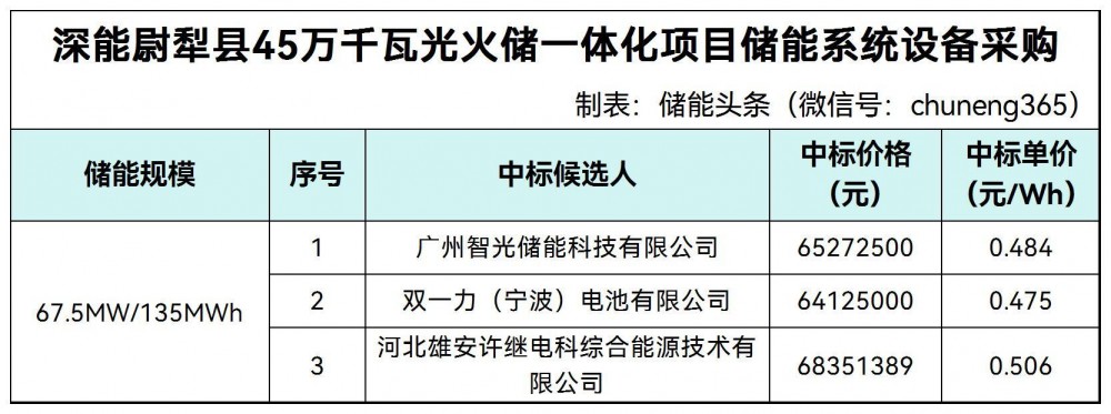 第一中标候选人为广州智光储能科技有限公司,投标报价为65272500元,折合单价0.484元/wh;第二中标候选人为双一力(宁波)电池有限公司,投标报价为64125000元,折合单价0.475元/wh;第三中标候选人为河北雄安许继电科综合能源技术有限公司,投标报价为68351389元,折合单价0.506元/wh。
