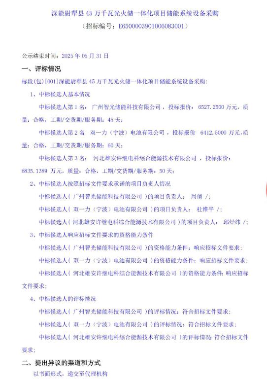 储能系统设备采购中标候选人公示。