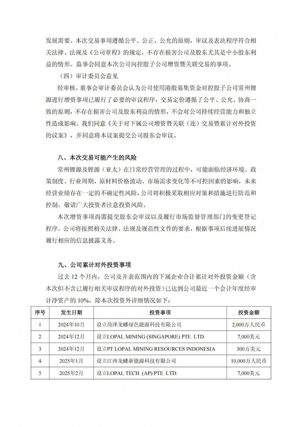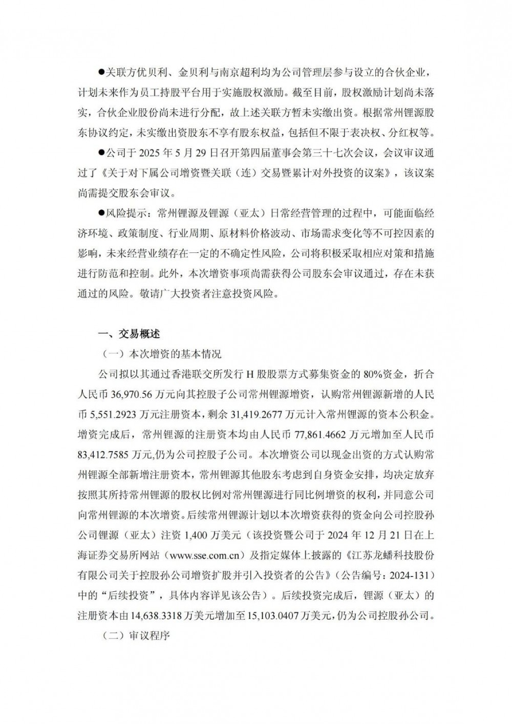 龙蟠科技表示,本次公司以现金出资形式对常州锂源进行增资并由常州锂源对其子公司增资,符合h股募集资金用途规划,有利于满足常州锂源及其下属公司生产建设及日常运营的资金需求,提高其资金实力和综合竞争力,符合公司发展战略规划和长远利益。本次增资事项涉及的资金来源为公司h股募集资金,增资完成后常州锂源仍为公司控股子公司,锂源(亚太)仍为公司控股孙公司,不会导致公司合并报表范围发生变化,不会对公司未来财务及经营状况产生不利影响,不存在损害公司及股东利益的情形。