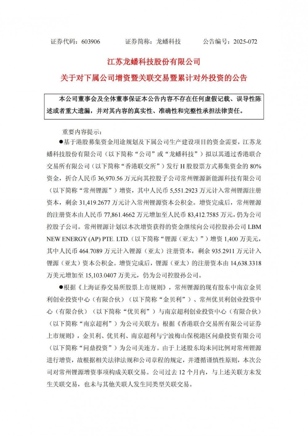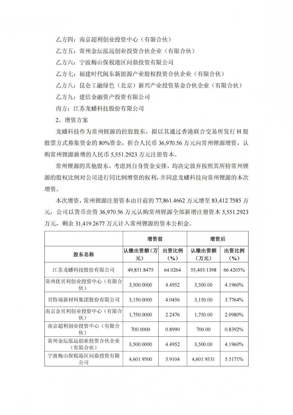 5月29日,龙蟠科技发布公告称,公司拟以其通过香港联合交易所有限公司发行h股股票方式募集资金的80%资金,折合人民币36,970.56万元向其控股子公司常州锂源新能源科技有限公司增资,其中人民币5,551.2923万元计入常州锂源注册资本,剩余31,419.2677 万元计入常州锂源资本公积金。
