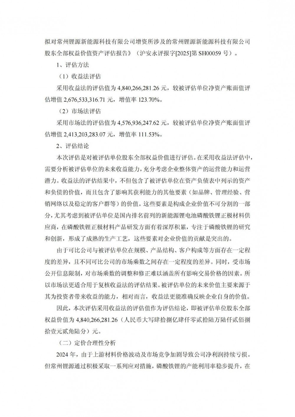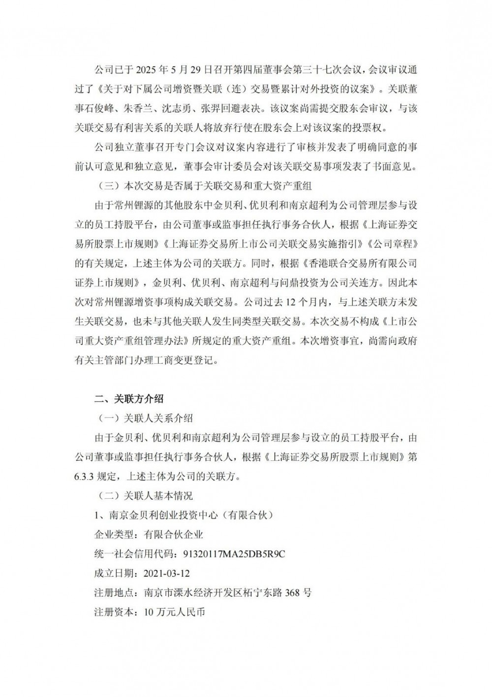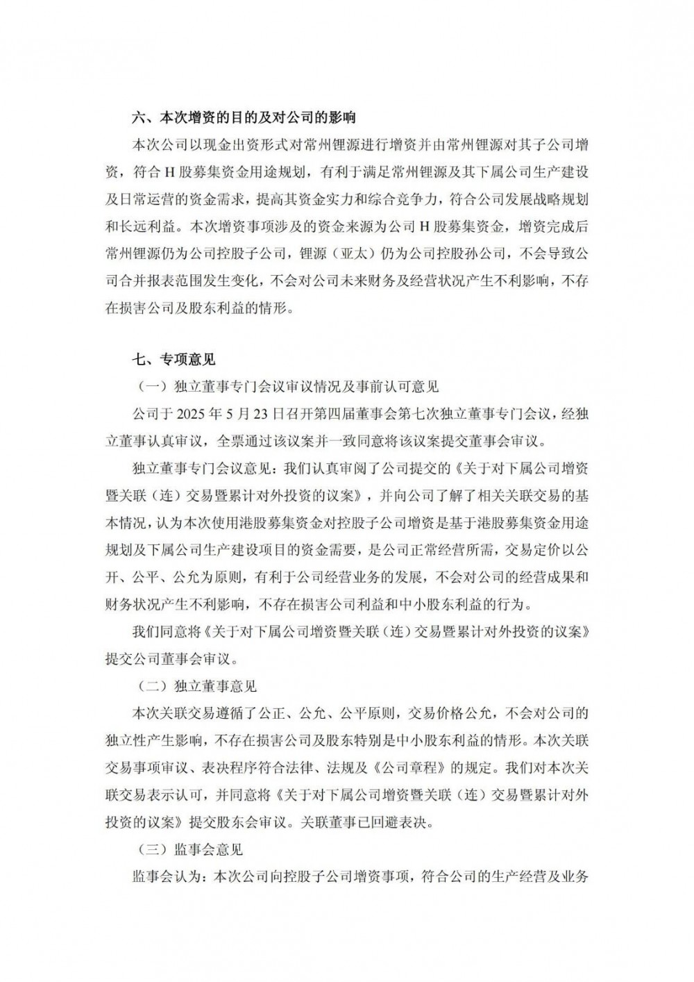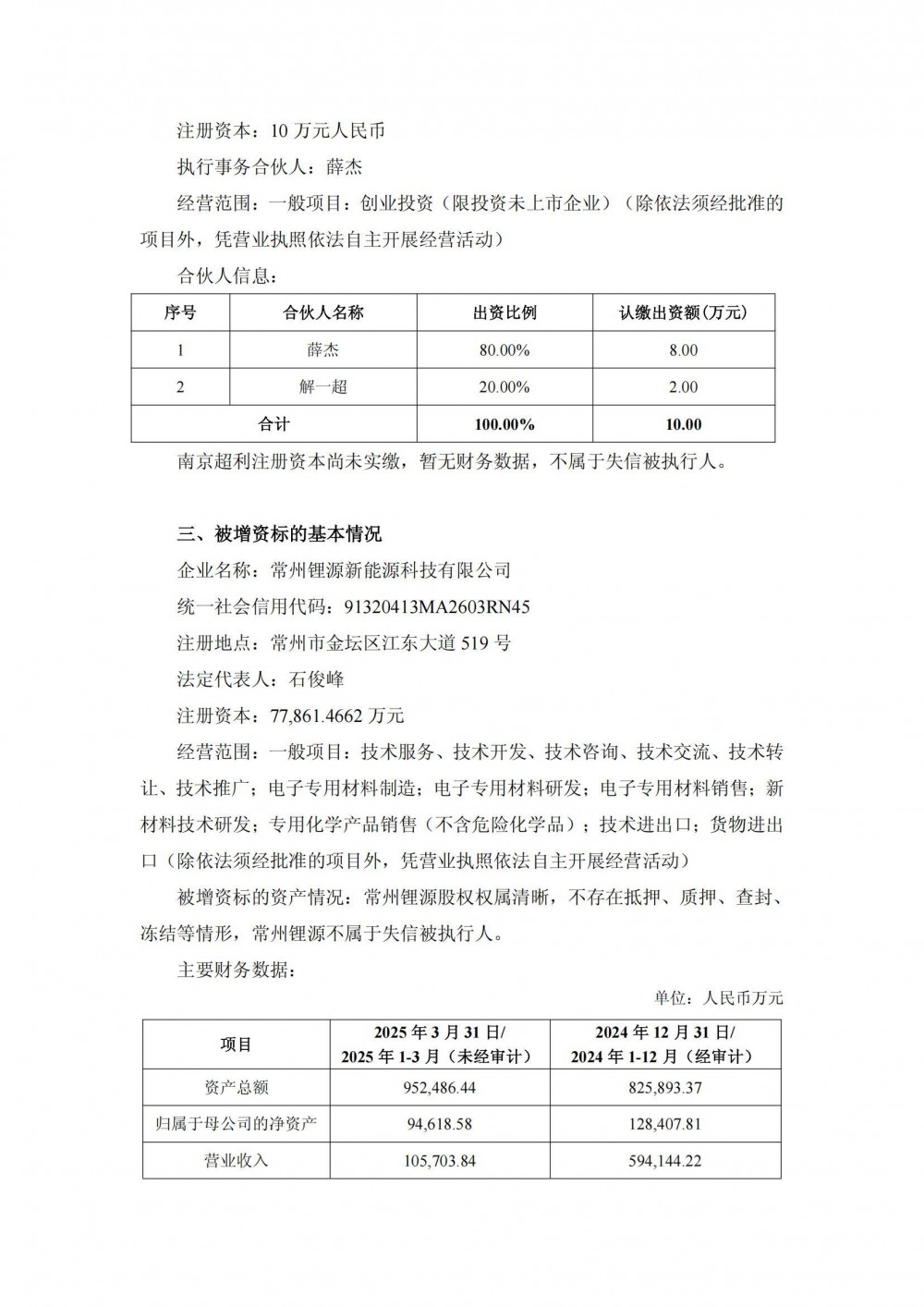 增资完成后,常州锂源的注册资本由人民币77,861.4662万元增加至人民币83,412.7585万元,仍为公司控股子公司。常州锂源计划以本次增资获得的资金继续向公司控股孙公司 lbmnew energy (ap) pte. ltd.增资1,400万美元,其中人民币464.7089万元计入锂源(亚太)注册资本,剩余935.2911万元计入锂源(亚太)资本公积金。增资完成后,锂源(亚太)的注册资本由14,638.3318万美元增加至15,103.0407万美元,仍为公司控股孙公司。