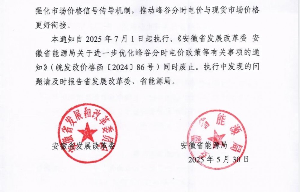 获悉,5月30日,安徽省发改委、安徽能源局关于进一步完善工商业峰谷分时电价政策有关事项的通知发布。通知自2025年7月1日起正式实施。本次发布的正式版与此前征求意见稿内容一致。主要变动为午间新增一个谷时段: