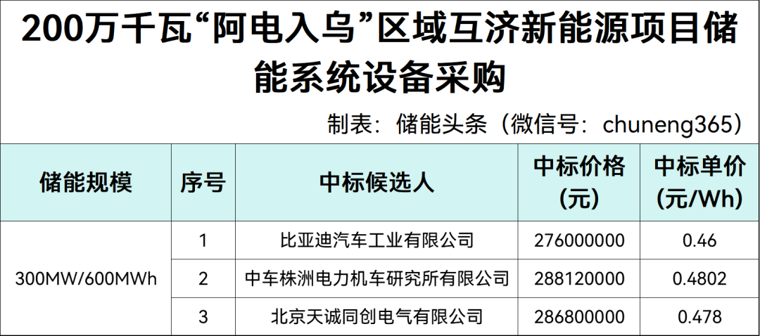 第一中标候选人为比亚迪汽车工业有限公司,投标报价276000000元,投标报价0.46元/wh;第二中标候选人为中车株洲电力机车研究所有限公司,投标报价288120000元,投标报价0.4802元/wh;第三中标候选人为北京天诚同创电气有限公司,投标报价286800000元,折合单价0.478元/wh。