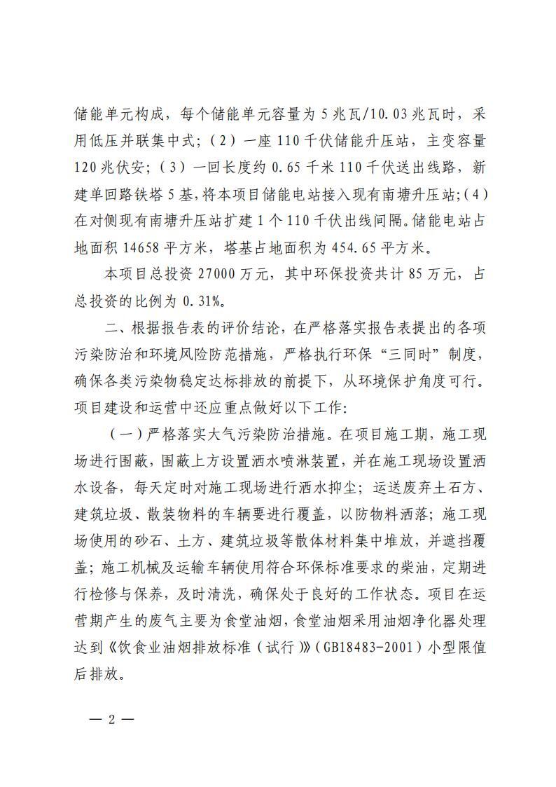 项目建设内容:(1)一座 100 兆瓦/200 兆瓦时的电化学储能电站,储能系统采用磷酸铁锂电池户外预制舱布置,由20个储能单元构成,每个储能单元容量为5 兆瓦/10.03 兆瓦时,采用低压并联集中式;(2)一座110 千伏储能升压站,主变容量120 兆伏安;(3)一回长度约 0.65 千米110 千伏送出线路,新建单回路铁塔 5 基,将本项目储能电站接入现有南塘升压站;(4)在对侧现有南塘升压站扩建 1 个110 千伏出线间隔。储能电站占地面积 14658 平方米,塔基占地面积为454.65 平方米。本项目总投资 27000 万元,其中环保投资共计85万元,占总投资的比例为 0.31%。