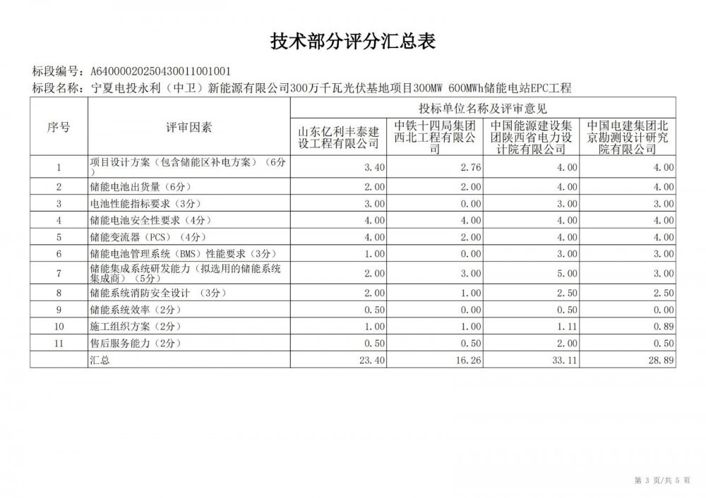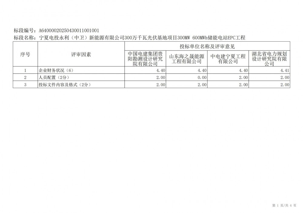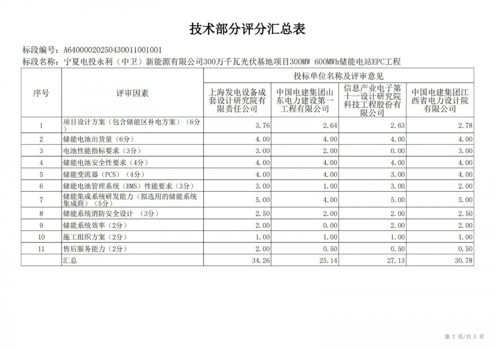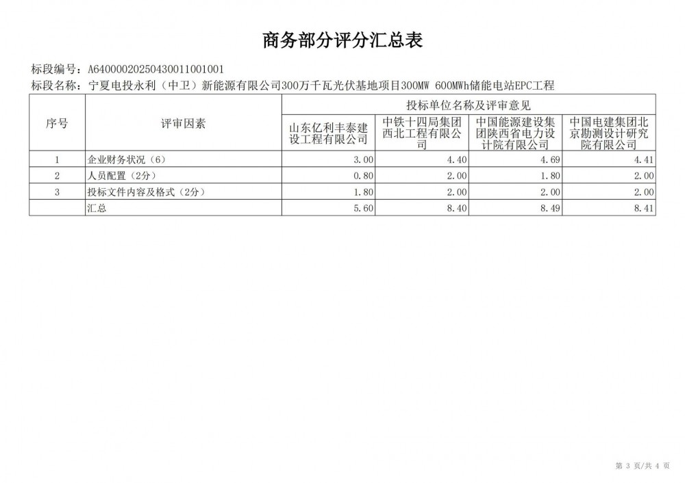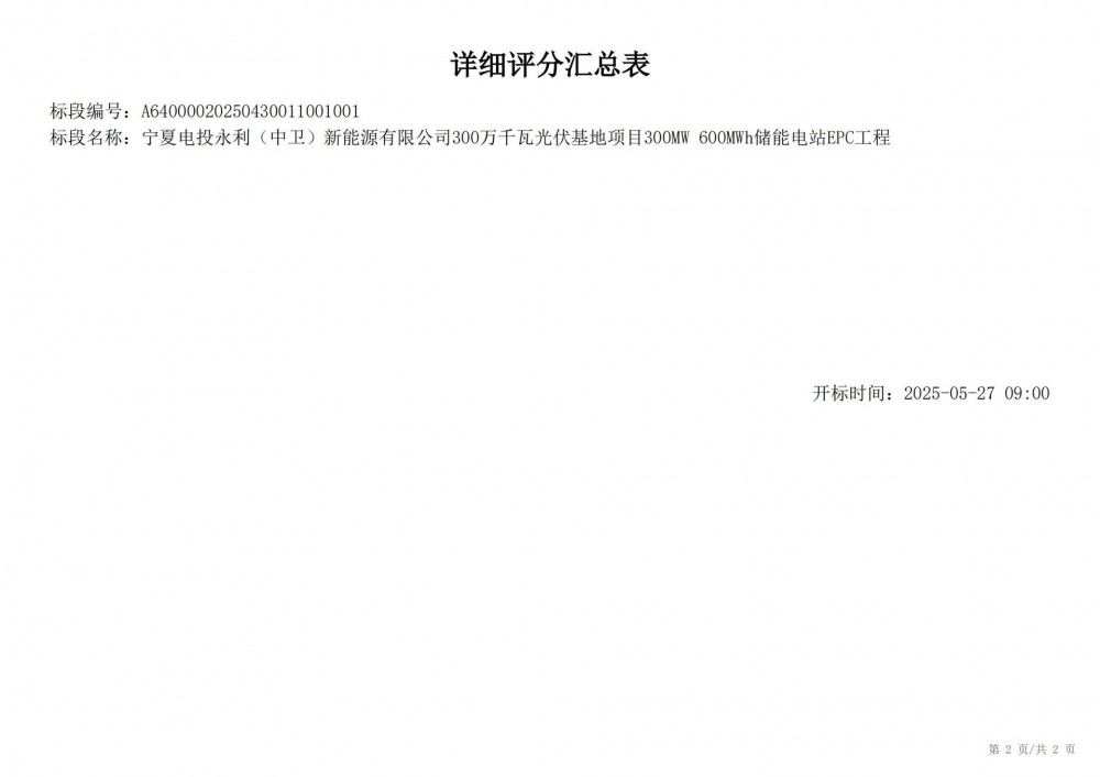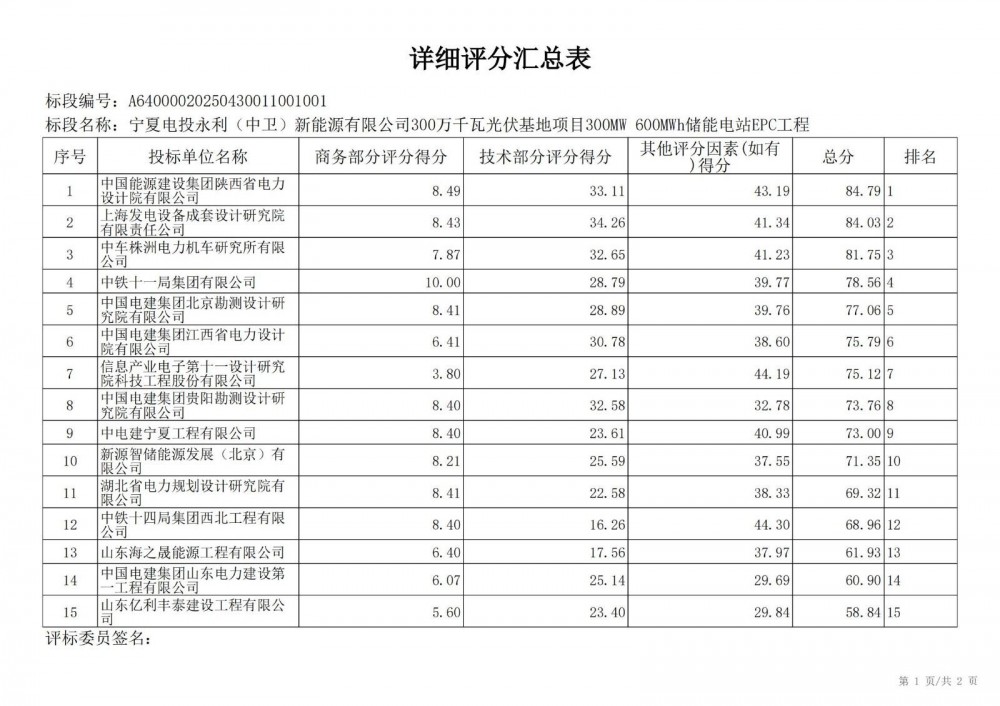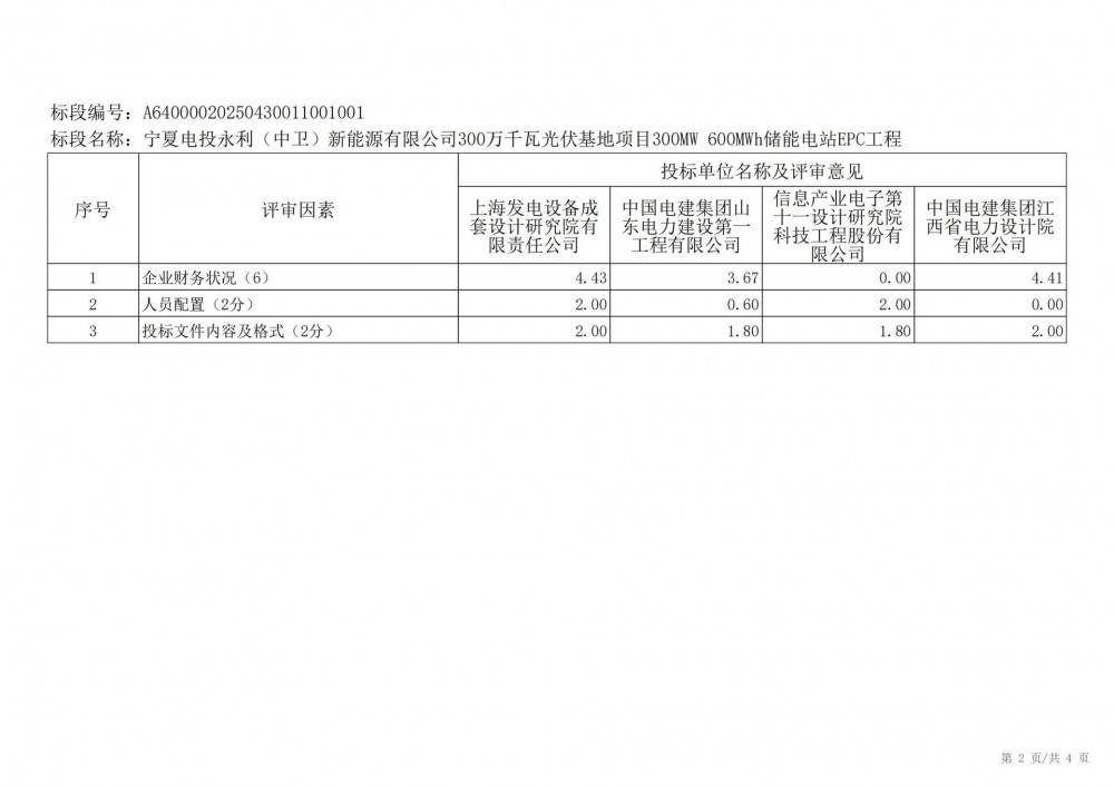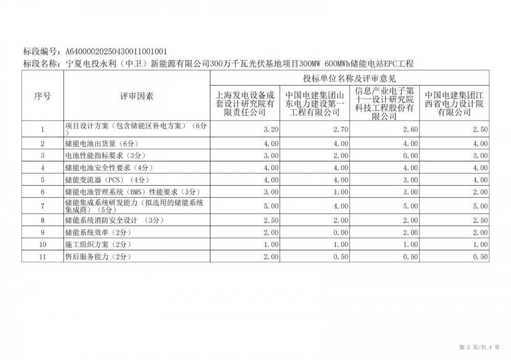 中国水利电力物资西安有限公司 受 宁夏电投永利(中卫)新能源有限公司 的委托,对 宁夏电投永利(中卫)新能源有限公司300万千瓦光伏基地项目300mw 600mwh储能电站epc工程宁夏电投永利(中卫)新能源有限公司300万千瓦光伏基地项目300mw 600mwh储能电站epc工程 进行 公开招标 ,已于2025-05-28 13:30:00完成评标工作,经评标委员会对所有投标人的投标文件详细评审,推荐出中标结果候选人。