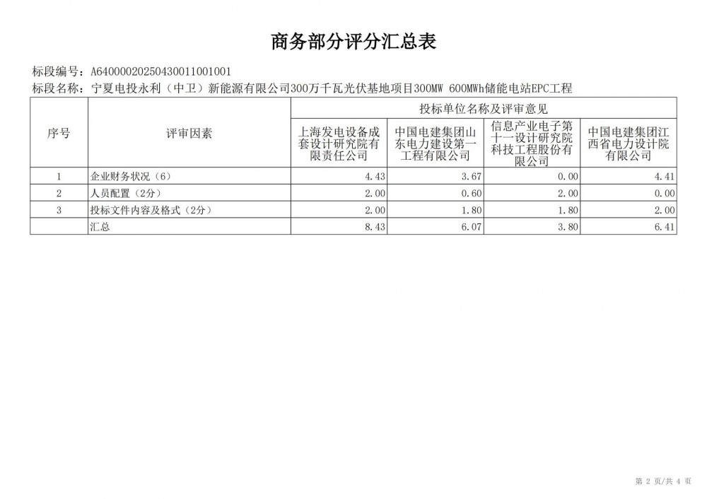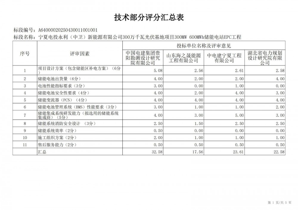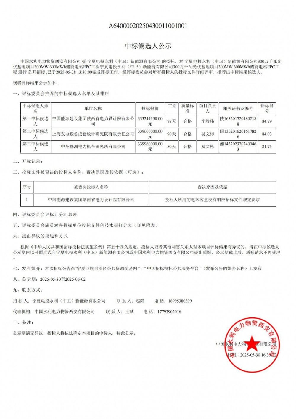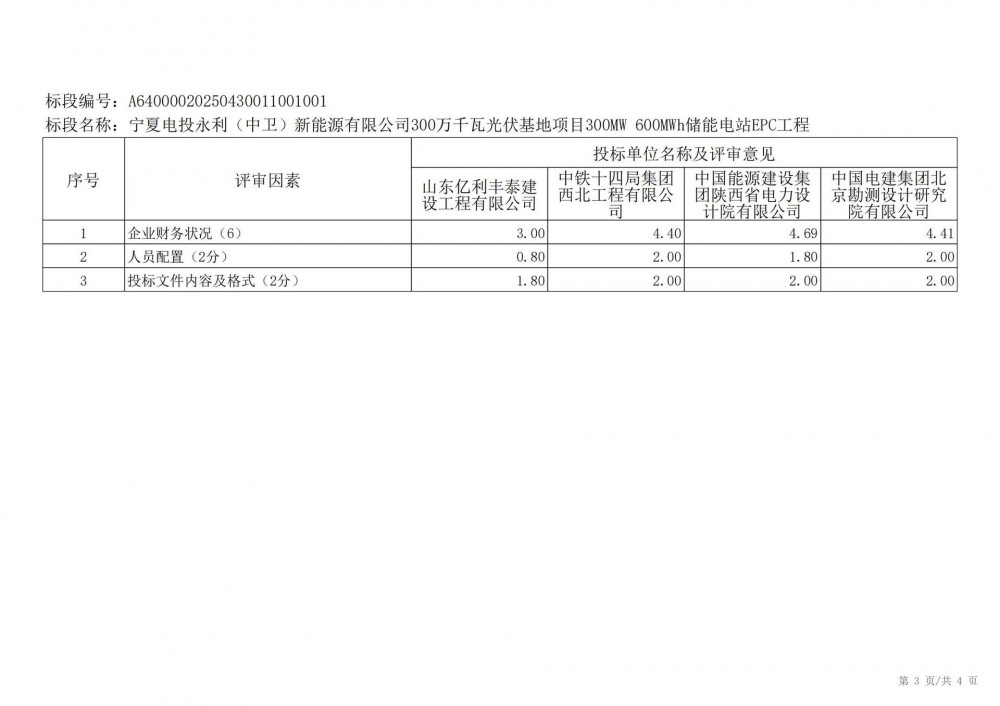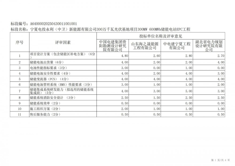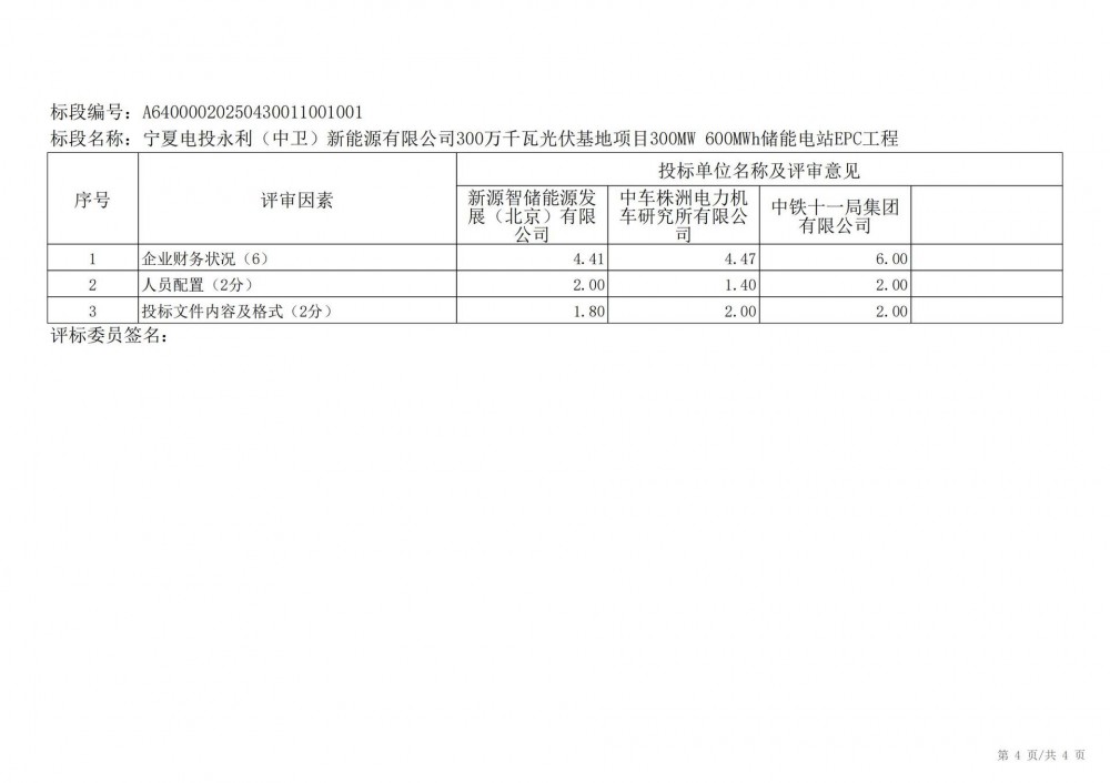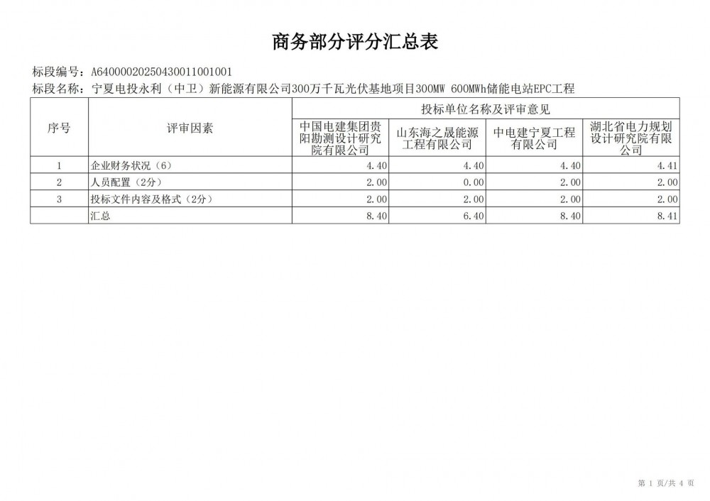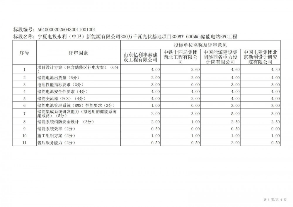 中国水利电力物资西安有限公司 受 宁夏电投永利(中卫)新能源有限公司 的委托,对 宁夏电投永利(中卫)新能源有限公司300万千瓦光伏基地项目300mw 600mwh储能电站epc工程宁夏电投永利(中卫)新能源有限公司300万千瓦光伏基地项目300mw 600mwh储能电站epc工程 进行 公开招标 ,已于2025-05-28 13:30:00完成评标工作,经评标委员会对所有投标人的投标文件详细评审,推荐出中标结果候选人。