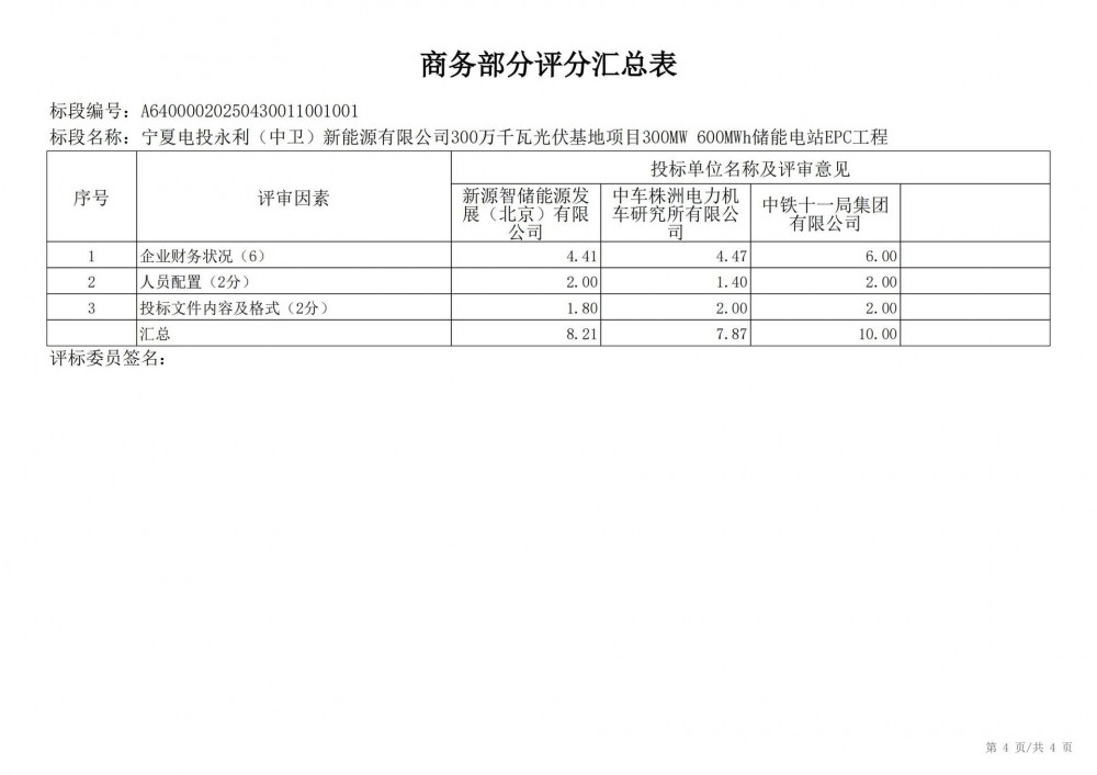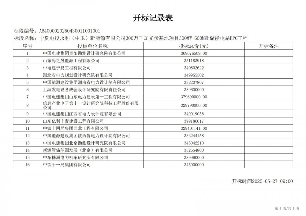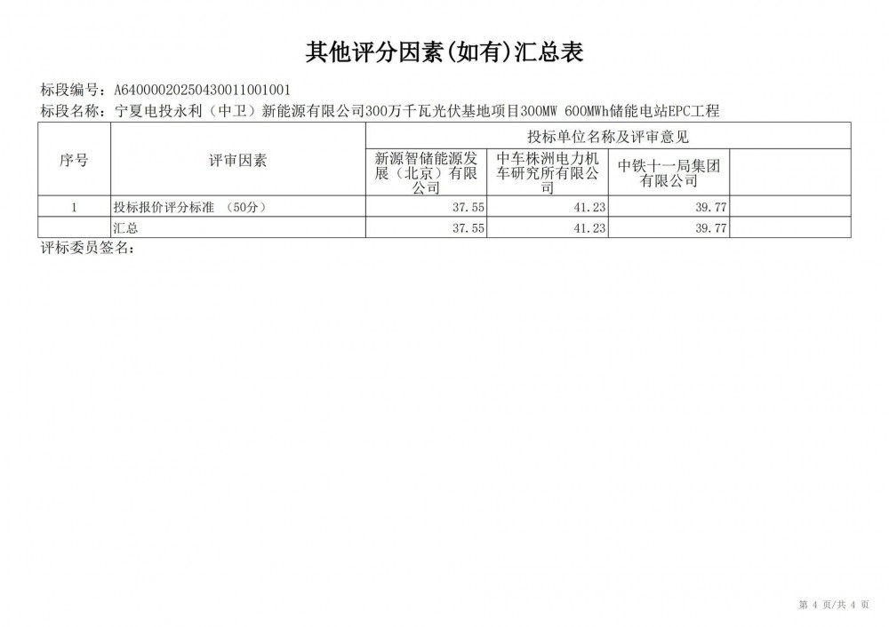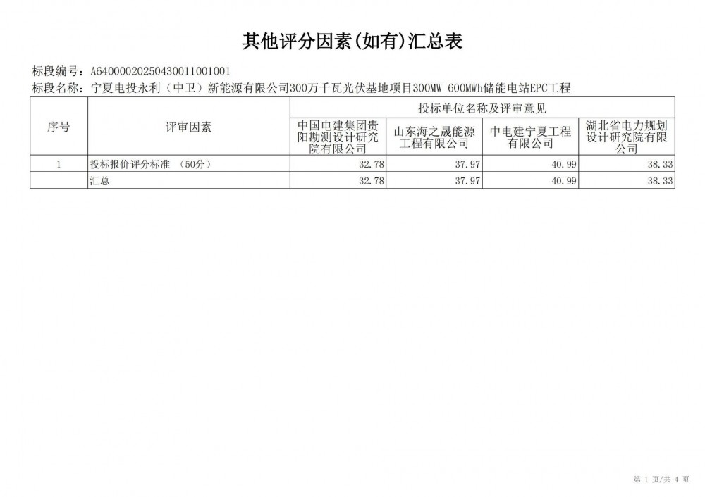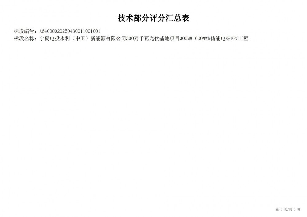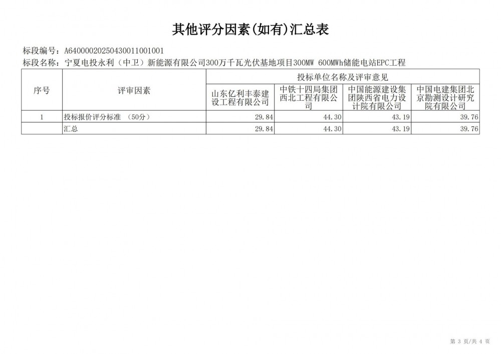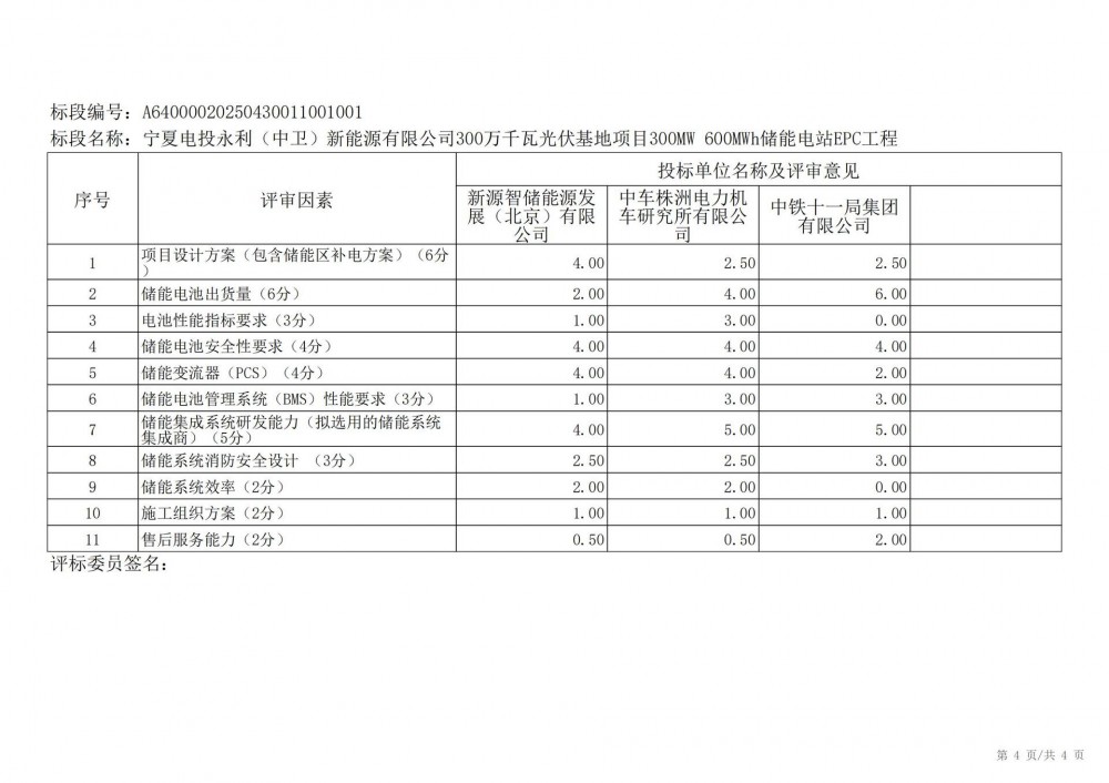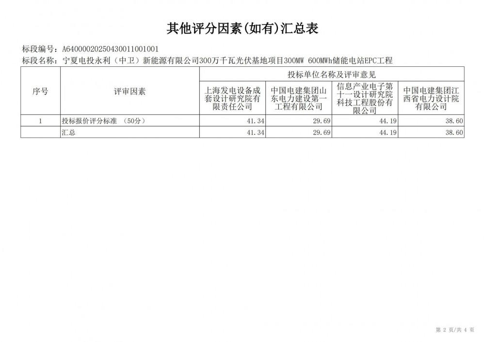 中国水利电力物资西安有限公司 受 宁夏电投永利(中卫)新能源有限公司 的委托,对 宁夏电投永利(中卫)新能源有限公司300万千瓦光伏基地项目300mw 600mwh储能电站epc工程宁夏电投永利(中卫)新能源有限公司300万千瓦光伏基地项目300mw 600mwh储能电站epc工程 进行 公开招标 ,已于2025-05-28 13:30:00完成评标工作,经评标委员会对所有投标人的投标文件详细评审,推荐出中标结果候选人。