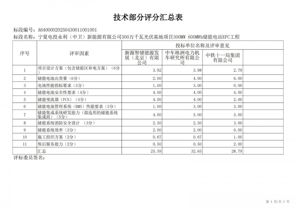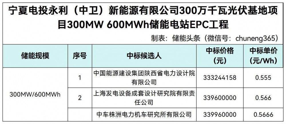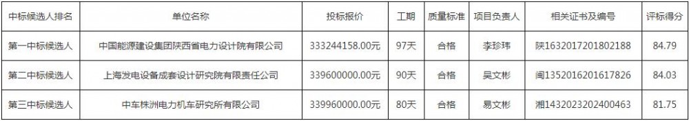 第一中标候选人为中国能源建设集团陕西省电力设计院有限公司,投标报价333244158元,投标报价0.555元/wh;第二中标候选人为上海发电设备成套设计研究院有限责任公司,投标报价339600000元,投标报价0.566元/wh;第三中标候选人为中车株洲电力机车研究所有限公司,投标报价339960000元,折合单价0.5666元/wh。
