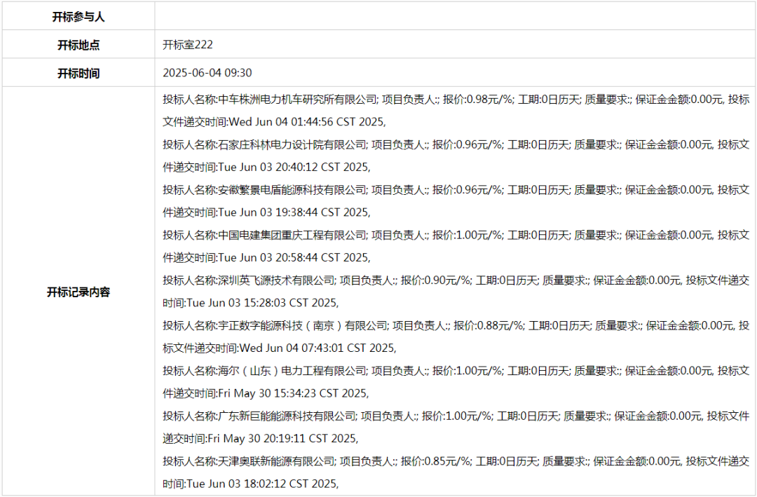 共计9家企业参与,报价范围0.8-1元/wh,平均报价为0.94元/wh。宇正数字能源科技(南京)有限公司报价最低,中国电建集团重庆工程有限公司、海尔(山东)电力工程有限公司和广东新巨能能源科技有限公司报价最高。