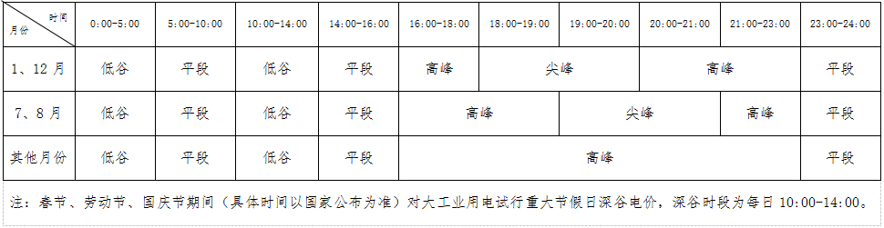 春节、劳动节、国庆节期间(具体时间以国家公布为准)对由电网企业代理购电的大工业用电试行重大节假日深谷电价,深谷时段为每日10:00-14:00。