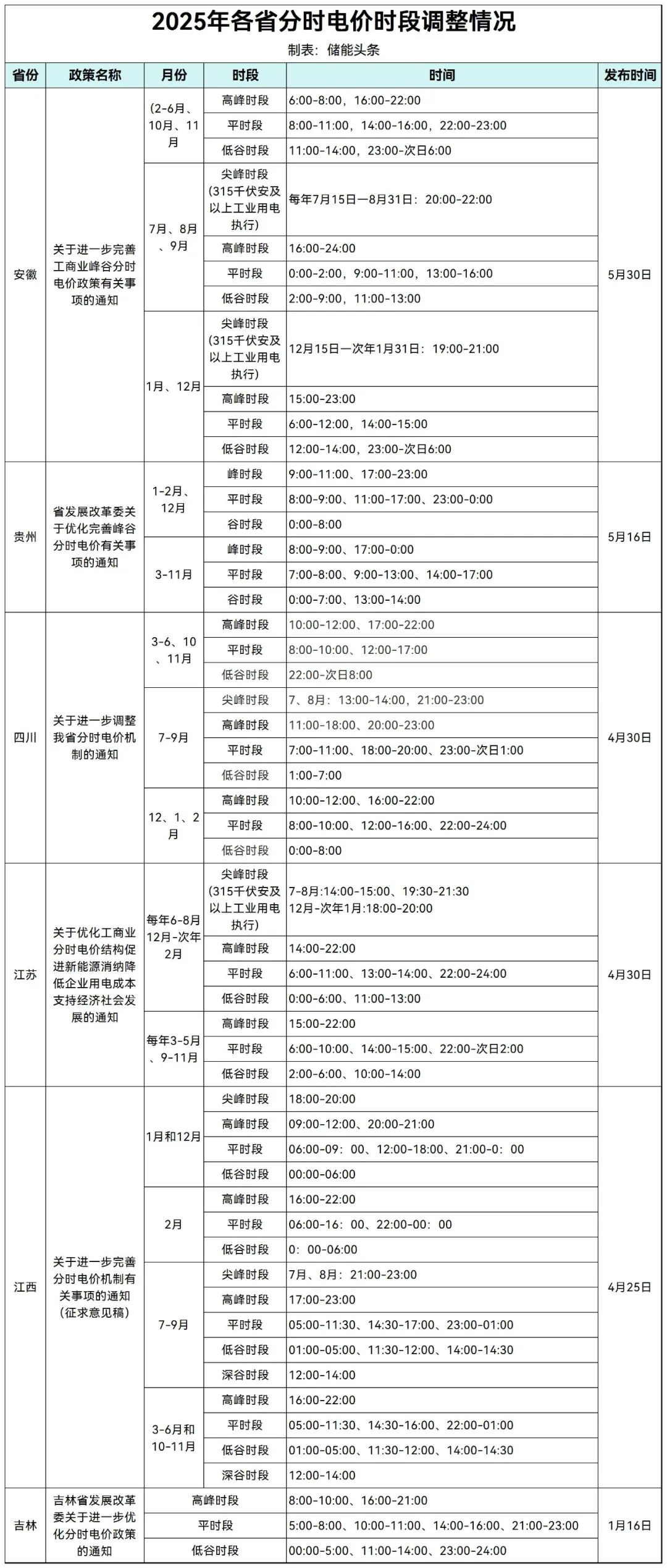 据储能头条统计,2025年至今,已有6省份下发调整分时电价政策,时段调整如下: