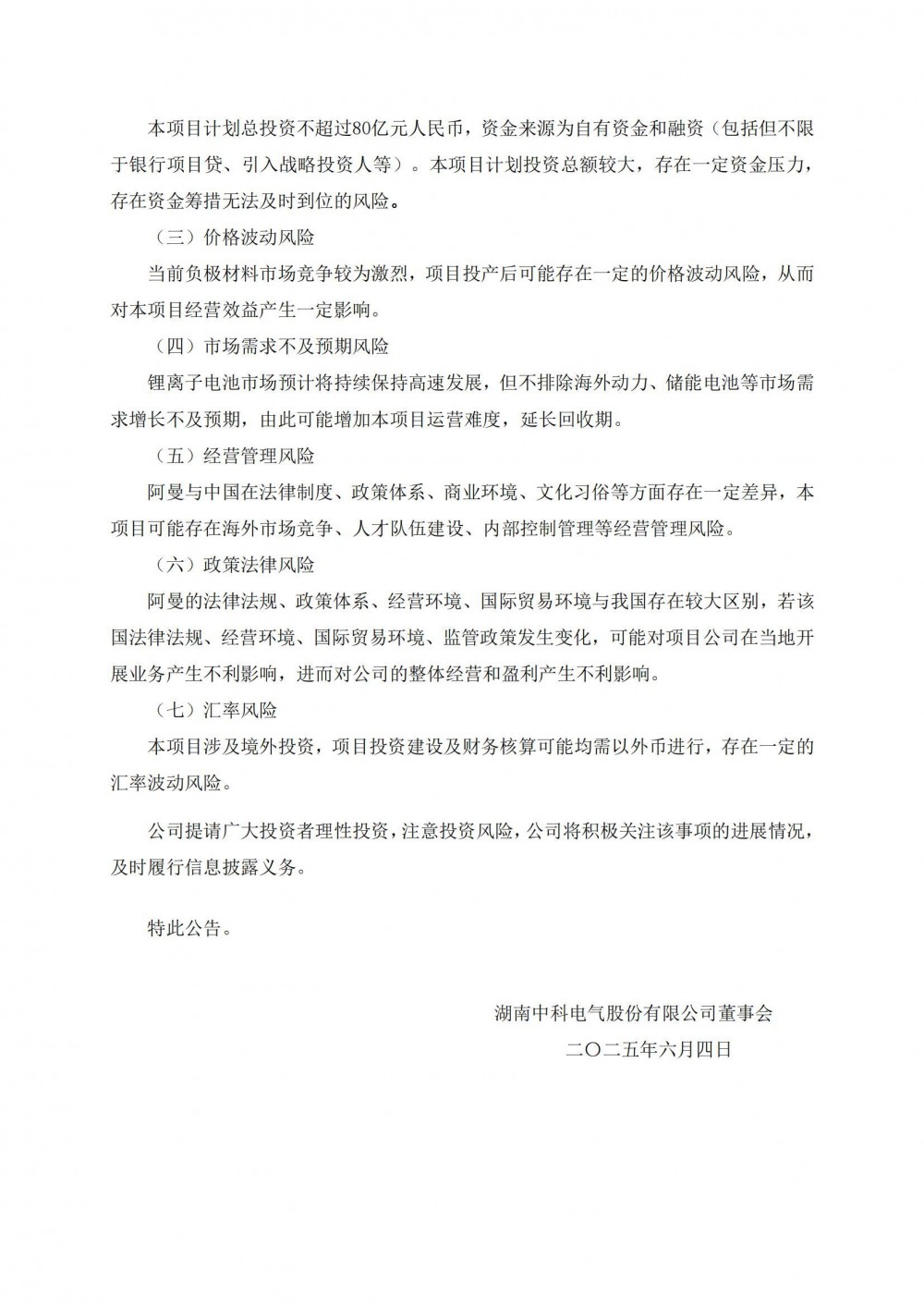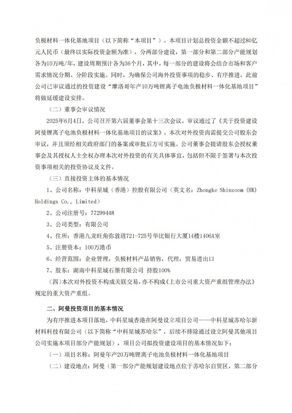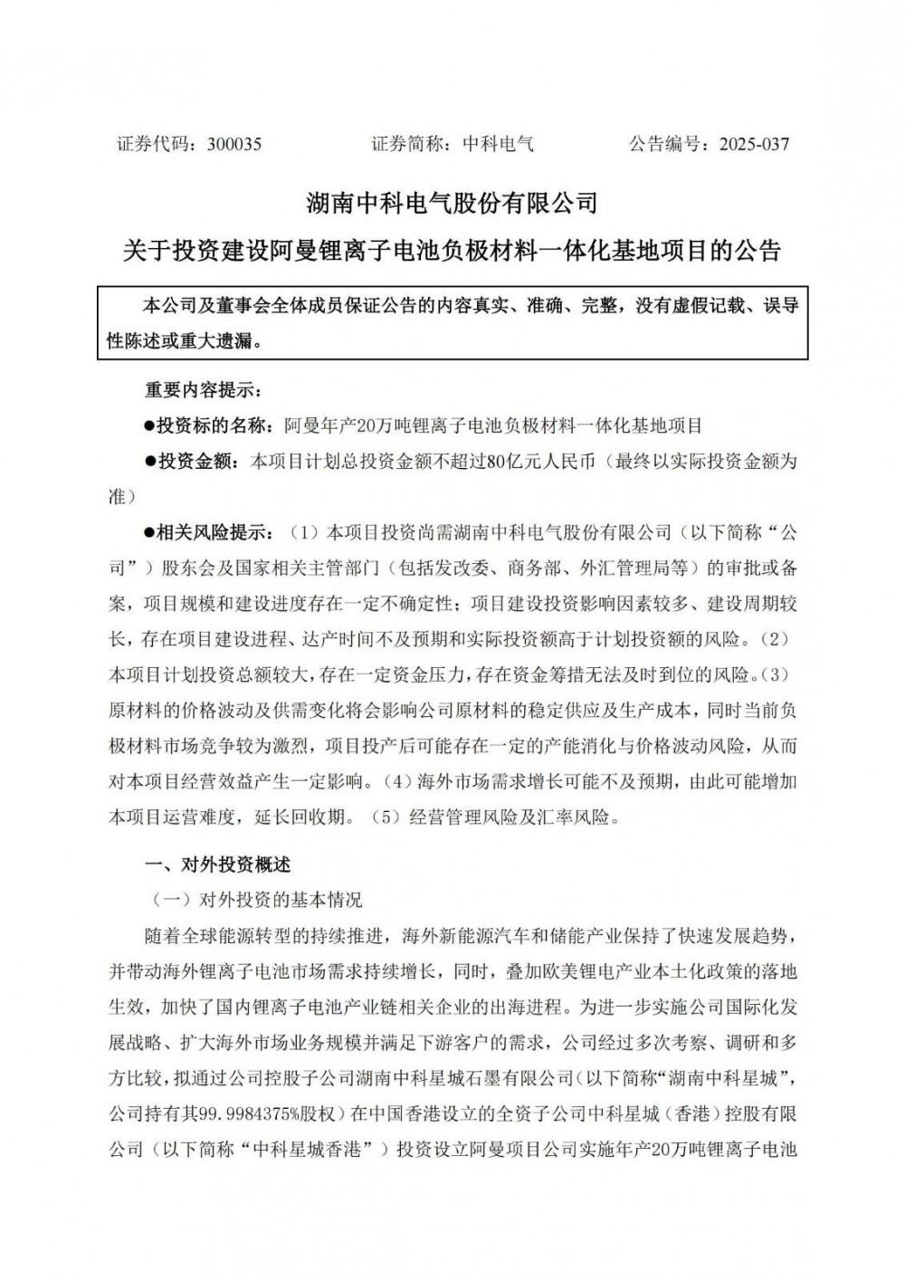 6月4日,中科电气发布公告称,公司经过多次考察、调研和多方比较,拟通过公司控股子公司湖南中科星城石墨有限公司在中国香港设立的全资子公司中科星城(香港)控股有限公司投资设立阿曼项目公司实施年产20万吨锂离子电池负极材料一体化基地项目。