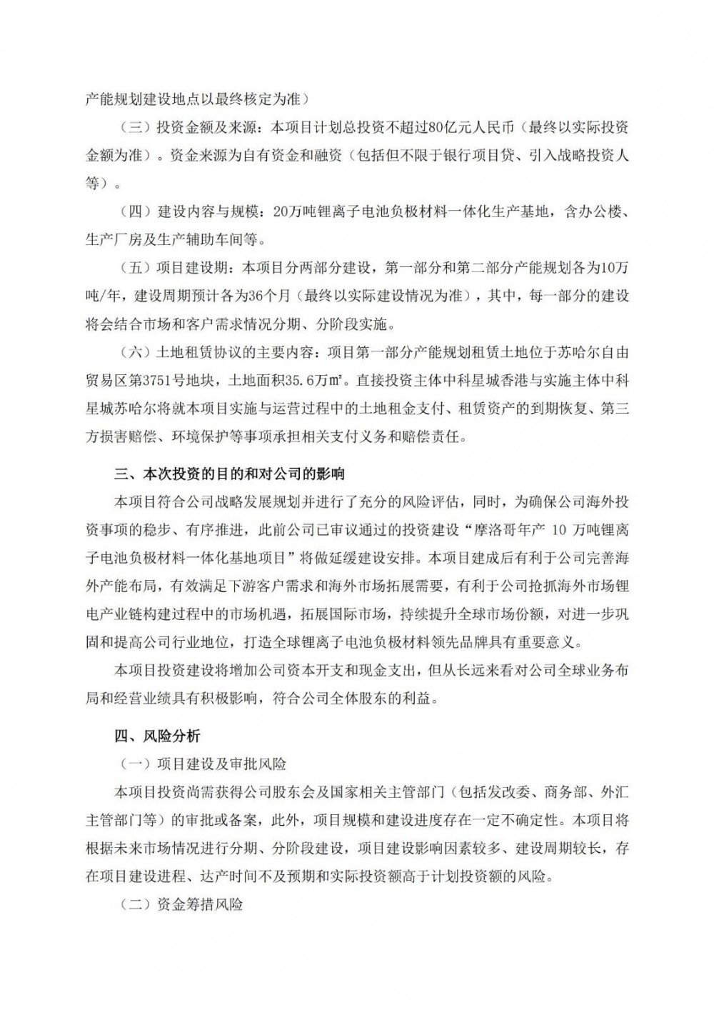 本项目计划总投资金额不超过80亿元人民币(最终以实际投资金额为准),分两部分建设,第一部分和第二部分产能规划各为10万吨/年,建设周期预计各为36个月,其中,每一部分的建设将会结合市场和客户需求情况分期、分阶段实施。同时,为确保公司海外投资事项的稳步、有序推进,此前公司已审议通过的投资建设“摩洛哥年产10万吨锂离子电池负极材料一体化基地项目”将做延缓建设安排。
