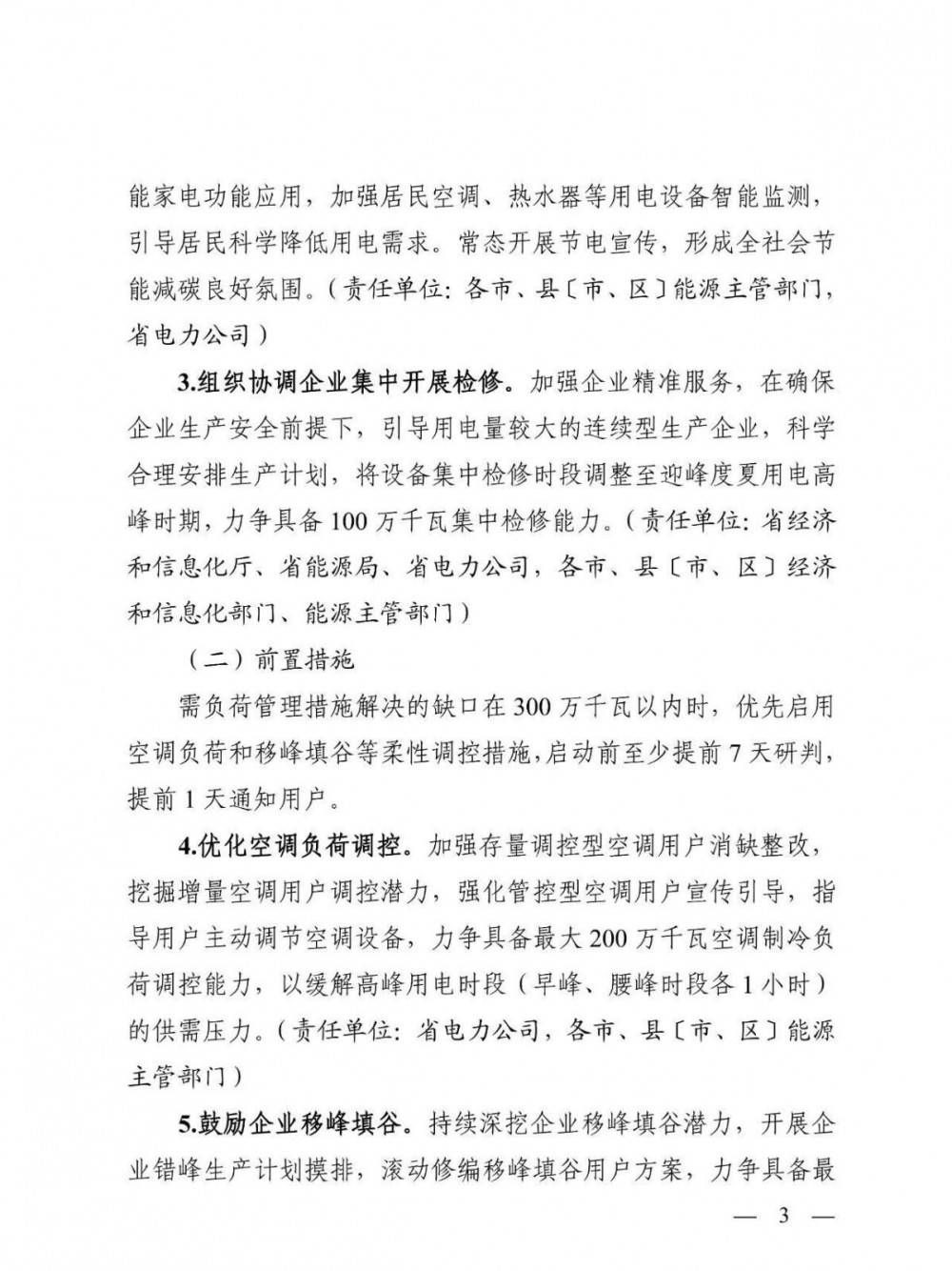 完善激励政策。完善需求响应市场化竞价机制,省级补贴优先通过分时盈余支出。创新出台针对虚拟电厂等新型市场主体的激励机制,最大限度激发其调节能力。各地要在迎峰度夏前出台空调负荷、移峰填谷和集中检修等补贴政策,激发广大用户参与需求侧响应积极性。