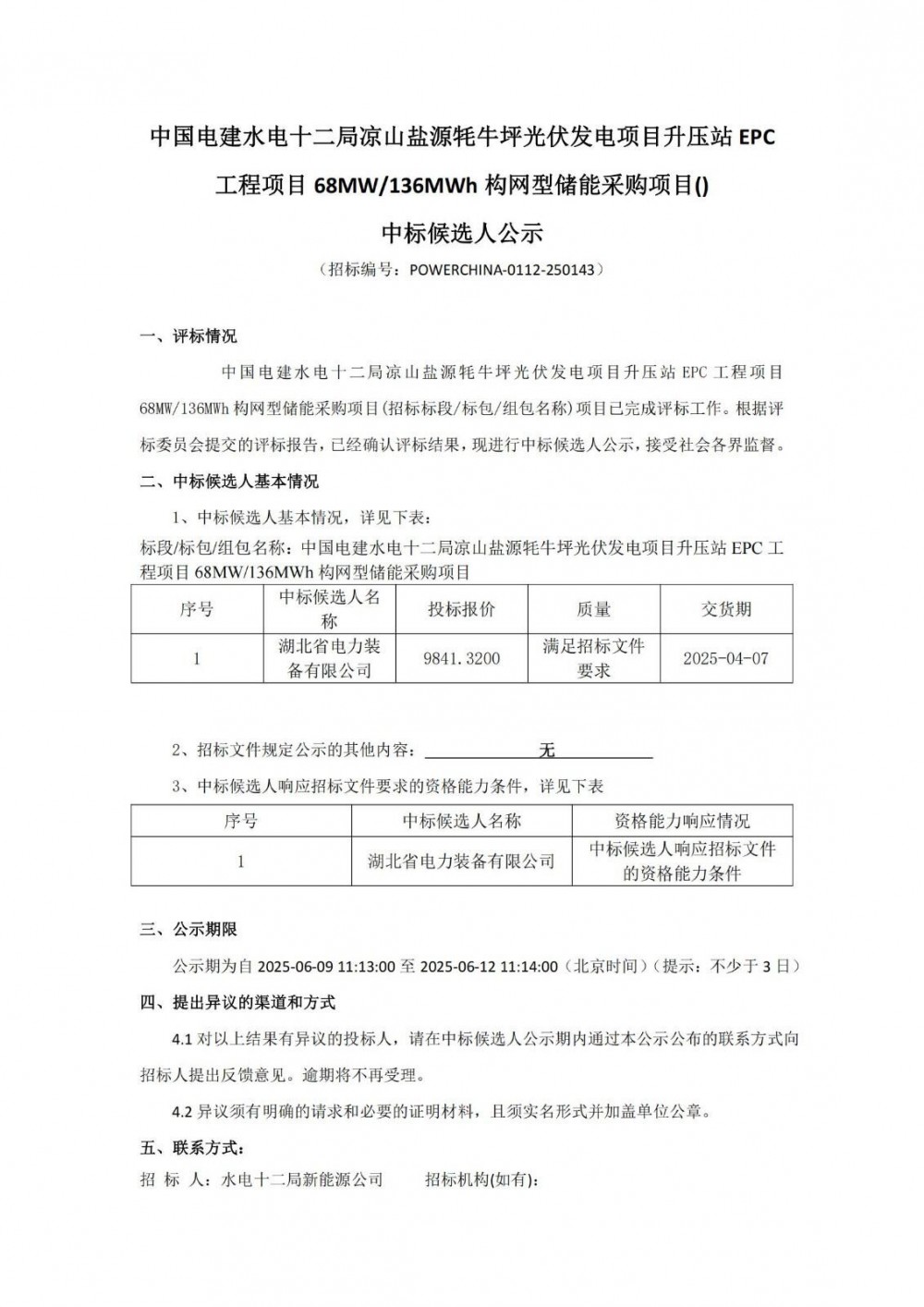 近日,中国电建水电十二局凉山盐源牦牛坪光伏发电项目升压站epc工程项目68mw/136mwh构网型储能采购项目中标候选人公示。