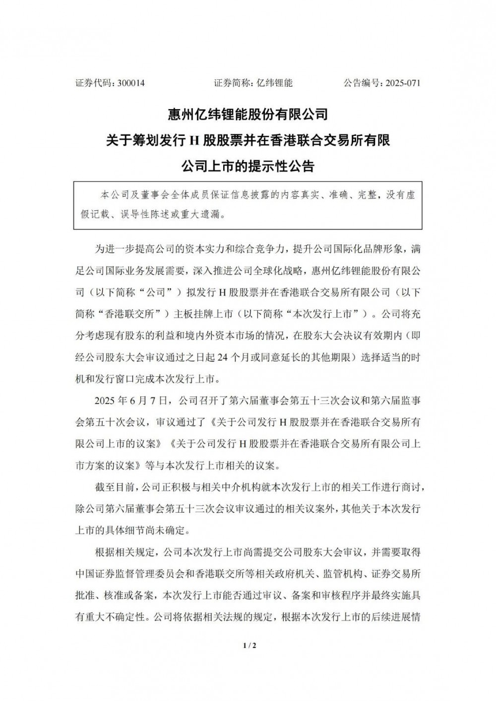 6月9日晚间,惠州亿纬锂能股份有限公司发布关于筹划发行h股股票并在香港联合交易所有限公司上市的提示性公告。