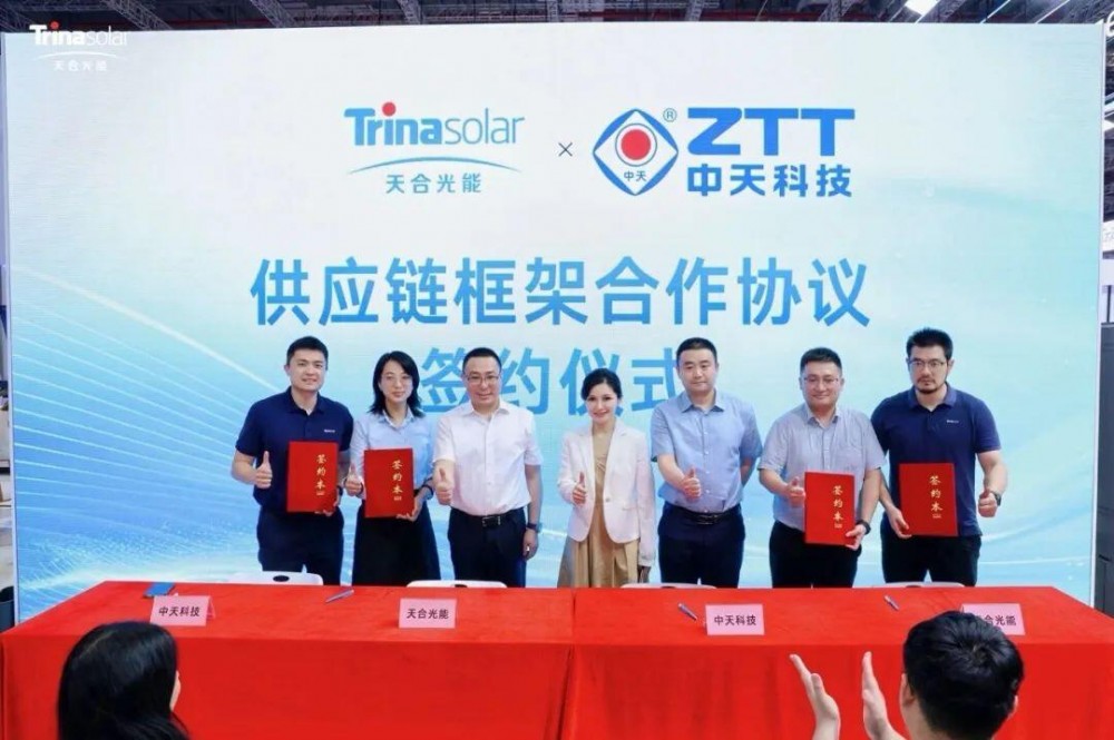 2025 年 snec 展会现场,天合光能与中天科技隆重签署供应链框架合作协议,携手书写行业佳话,现场星光熠熠,中天科技集团董事长薛驰、天合光能联席董事长兼k8凯发的解决方案事业群总裁、天合富家董事长兼总裁高海纯、中天新能源产业集团总裁缪永华共同见证这一标志新能源产业融合升级的历史性时刻。