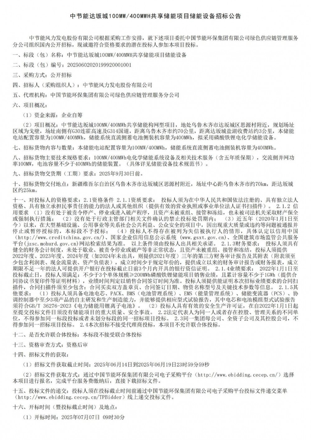 6月13日,中节能达坂城100mw/400mwh共享储能项目储能设备招标公告发布。