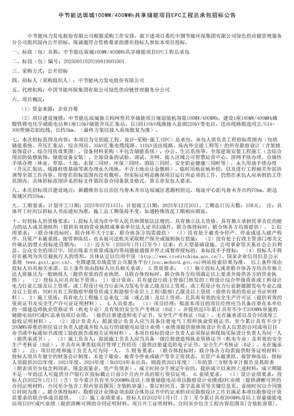 6月13日,中节能达坂城100mw/400mwh共享储能项目epc工程总承包招标公告发布,招标人为中节能风力发电股份有限公司,位于新疆维吾尔自治区乌鲁木齐市达坂城区思源村附近。