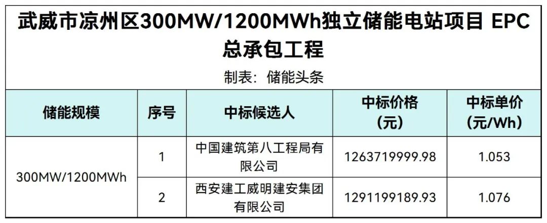 第一中标候选人为中国建筑第八工程局有限公司,投标报价1263719999.98元,折合单价1.053元/wh;第二中标候选人为西安建工威明建安集团有限公司,投标报价1291199189.93元,折合单价1.076元/wh。