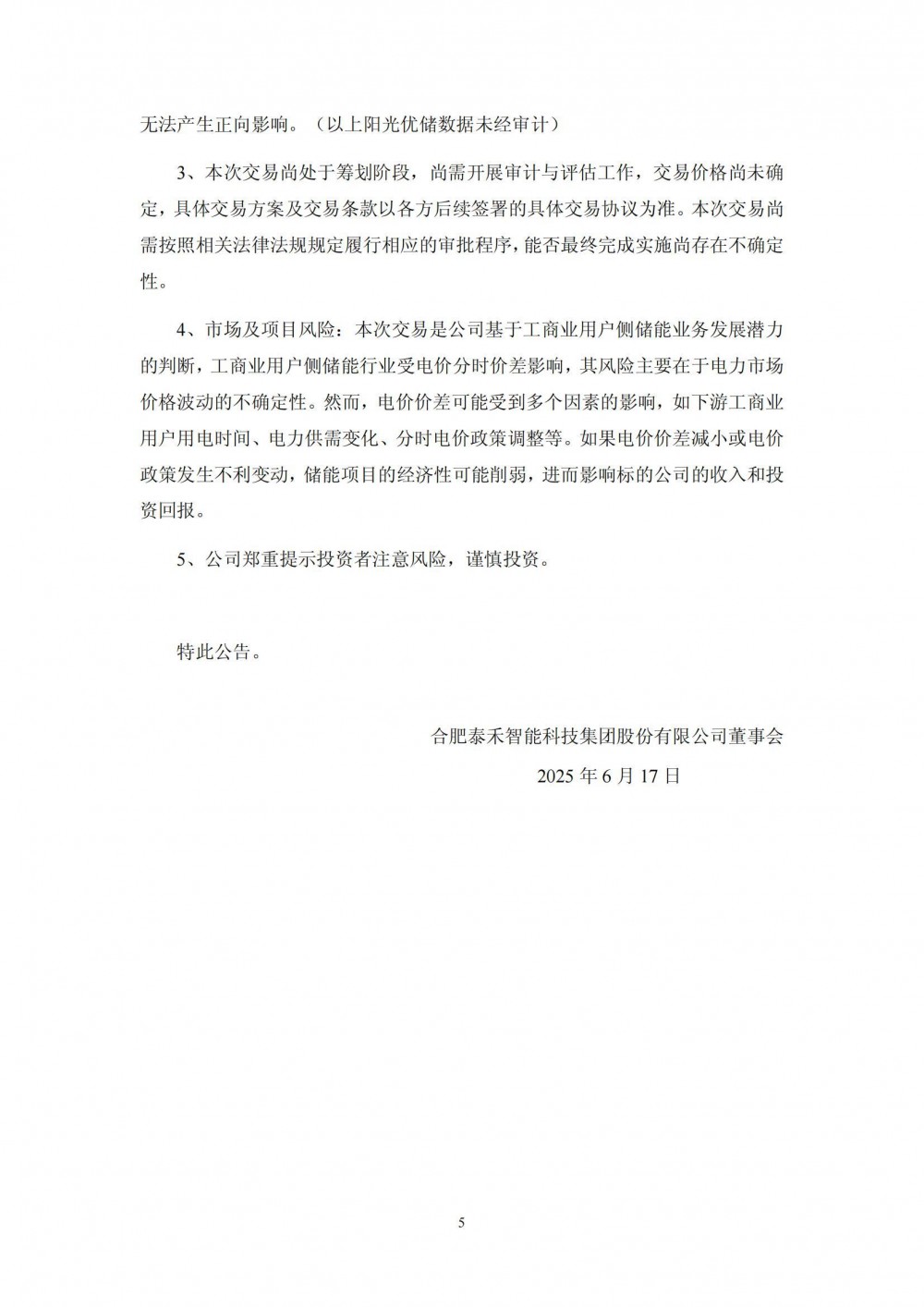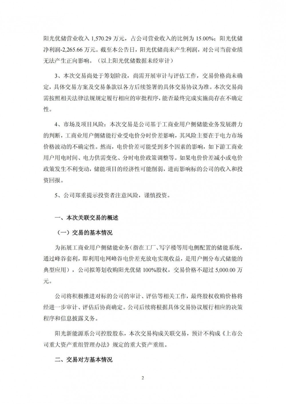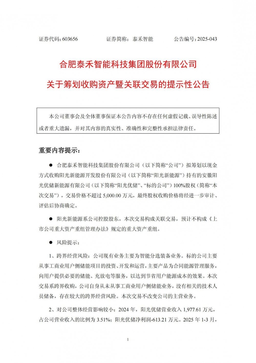 6月16日,泰禾智能发布公告称,公司拟筹划以现金方式收购阳光新能源开发股份有限公司持有的安徽阳光优储新能源有限公司100%股权,交易价格不超过 5,000.00 万元,最终股权收购价格将经进一步审计、评估后协商确定。